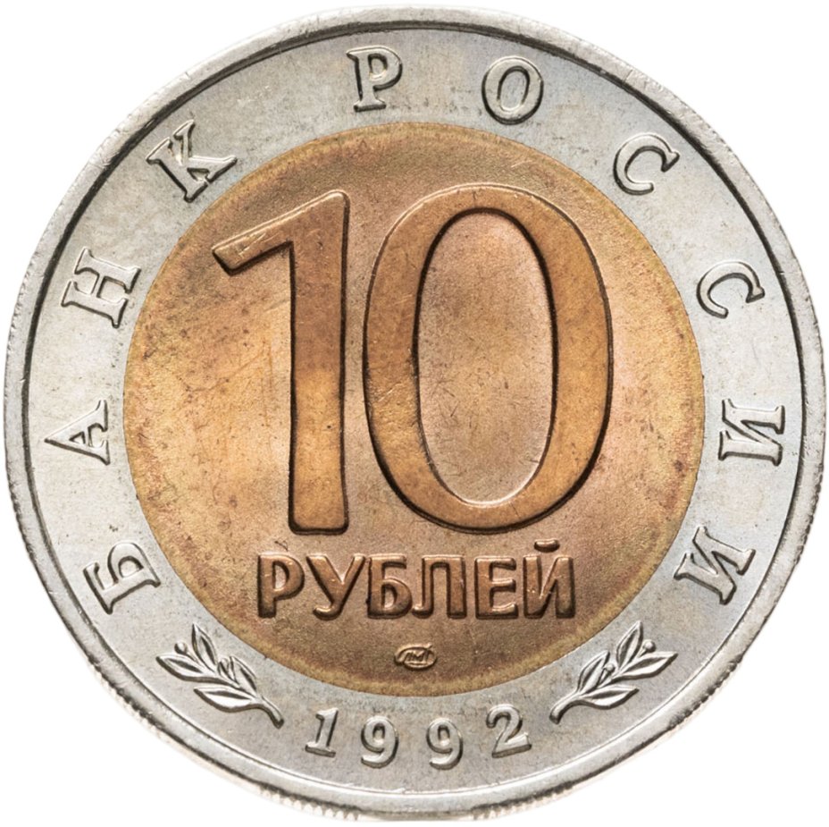 Сверху вдоль края монеты слова «БАНК РОССИИ», внизу год чеканки «1992», в середине номинал «10» под ним слово «РУБЛЕЙ», ниже монограмма монетного двора «ЛМД».