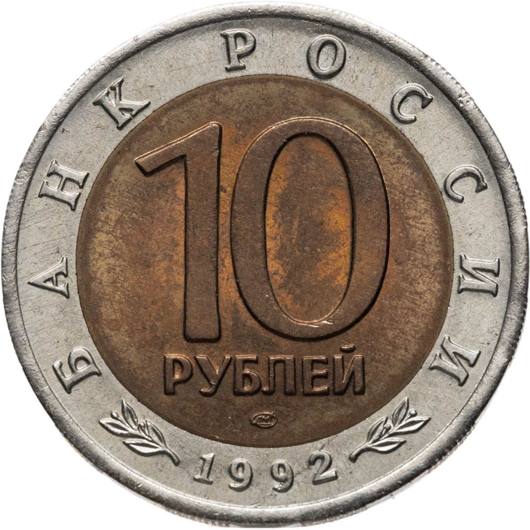 Сверху вдоль края монеты слова «БАНК РОССИИ», внизу год чеканки «1992», в середине номинал «10» под ним слово «РУБЛЕЙ», ниже монограмма монетного двора «ЛМД».