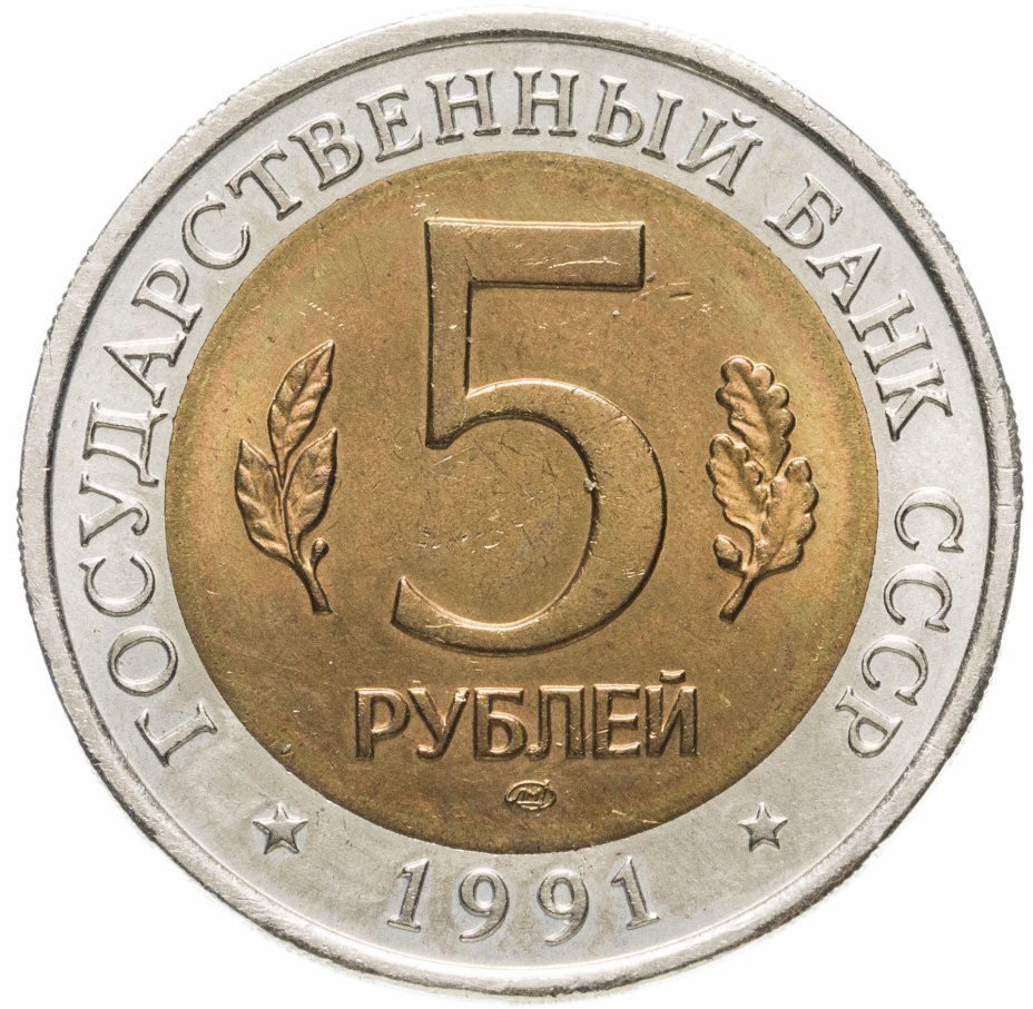 сверху вдоль края монеты слова «ГОСУДАРСТВЕННЫЙ БАНК СССР», внизу год чеканки «1991», в середине номинал «5», слева - лавровая ветвь, справа - дубовая ветвь, ниже слово «РУБЛЕЙ», ниже монограмма монетного двора «ЛМД».
