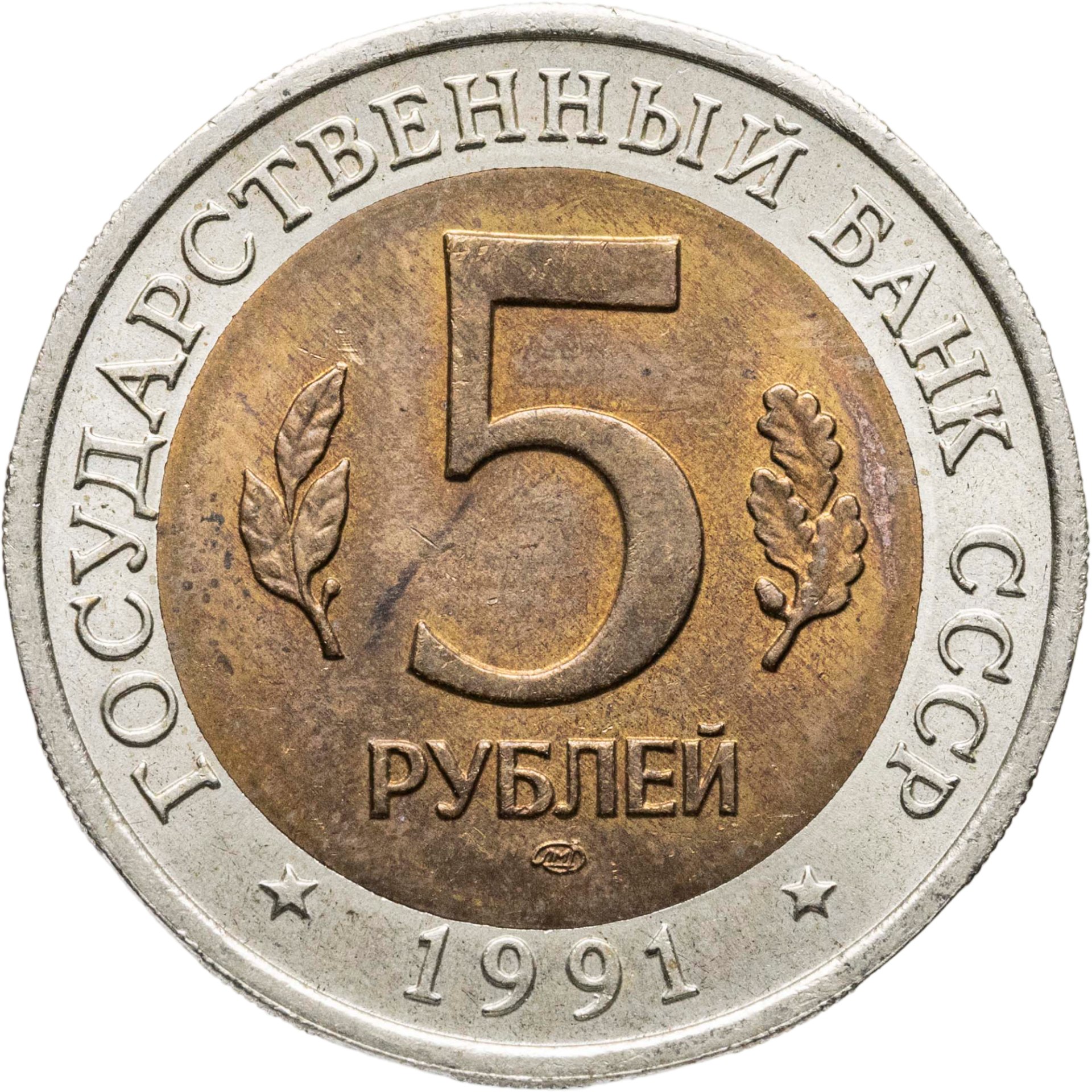 сверху вдоль края монеты слова «ГОСУДАРСТВЕННЫЙ БАНК СССР», внизу год чеканки «1991», в середине номинал «5», слева - лавровая ветвь, справа - дубовая ветвь, ниже слово «РУБЛЕЙ», ниже монограмма монетного двора «ЛМД».