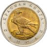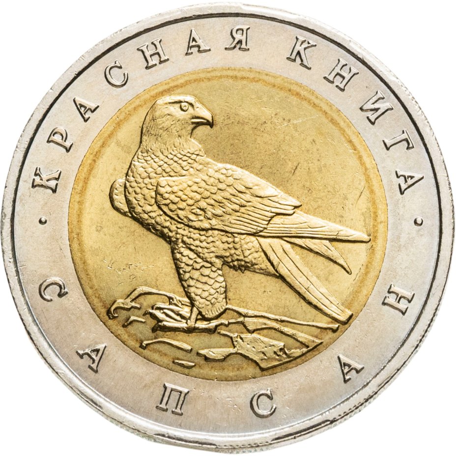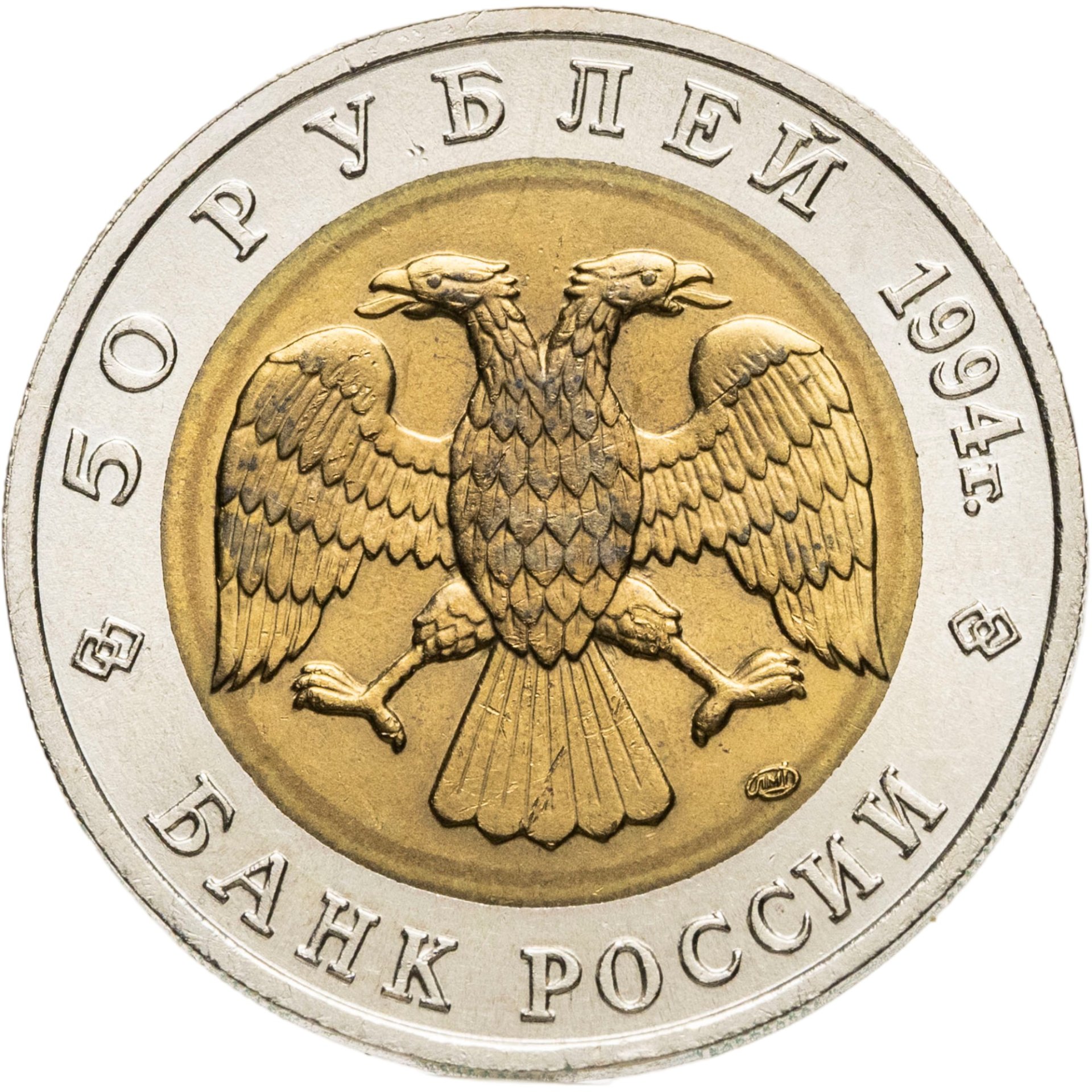Вверху вдоль канта номинал «50 рублей» и год выпуска «1994 г.», внизу слова «БАНК РОССИИ». В середине двуглавый орел под ним справа монограмма монетного двора «ЛМД».