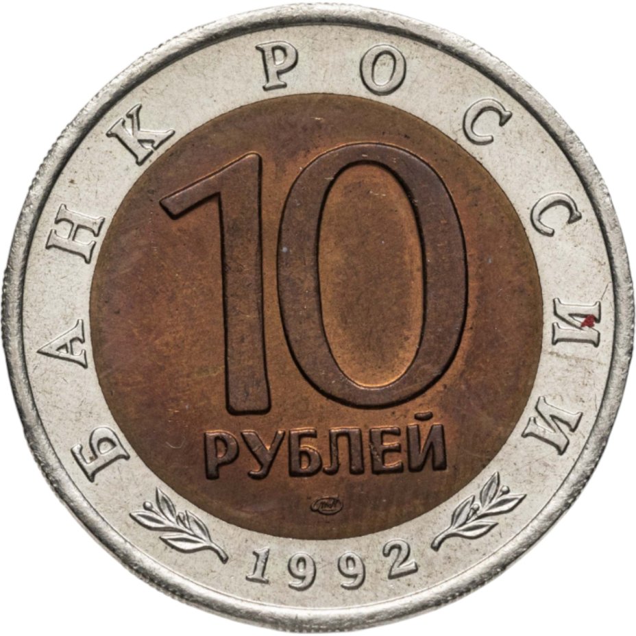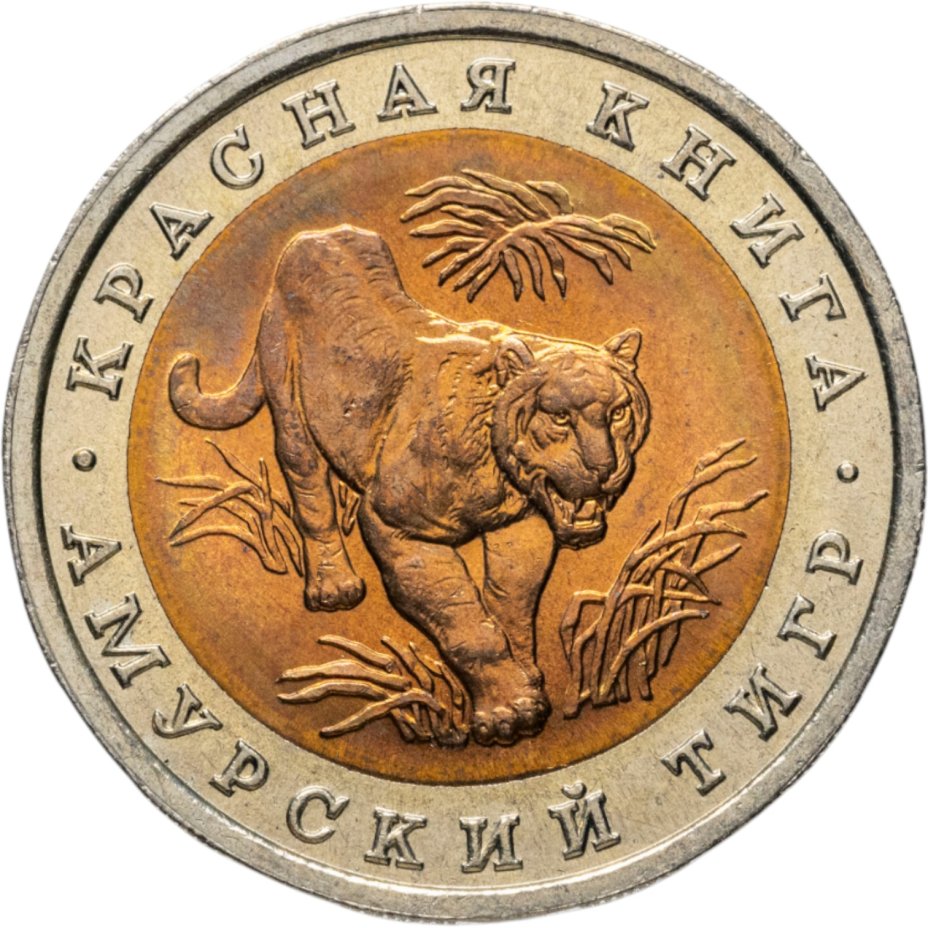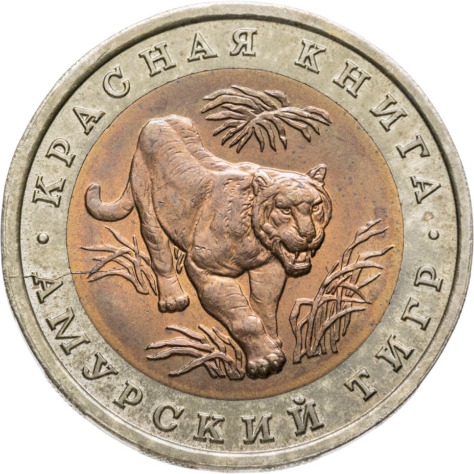- В 1992 году также чеканится биметалл. Номинал увеличивается вдвое: теперь монеты «Красная книга» имеют достоинство 10 рублей. На реверсах появляются амурский тигр, краснозобая казарка, среднеазиатская кобра.