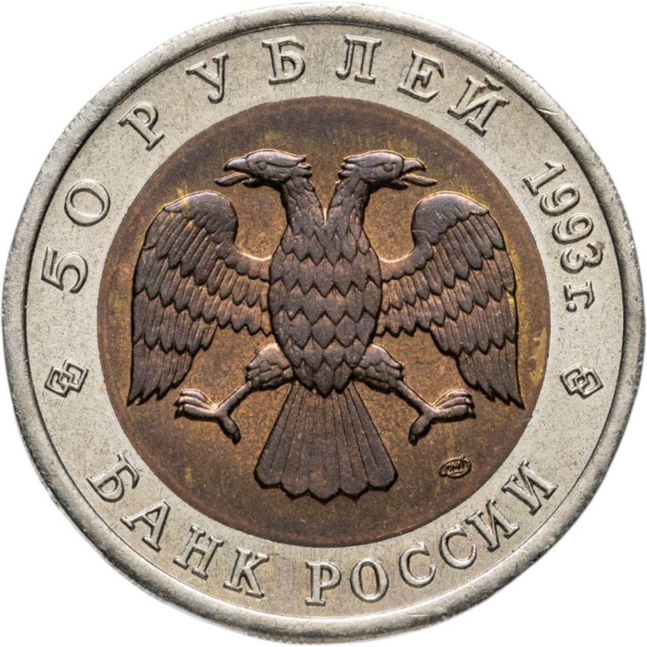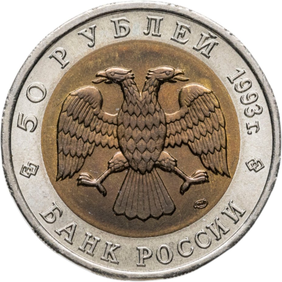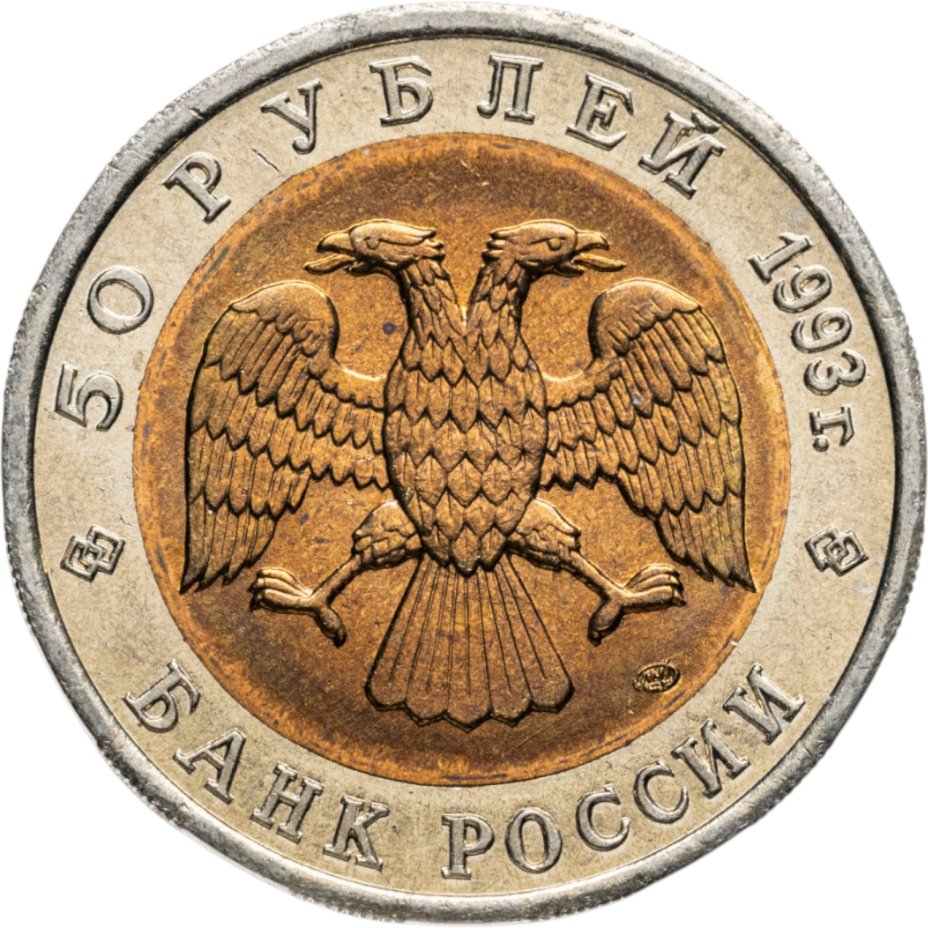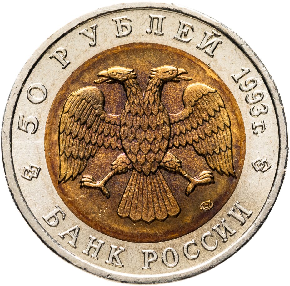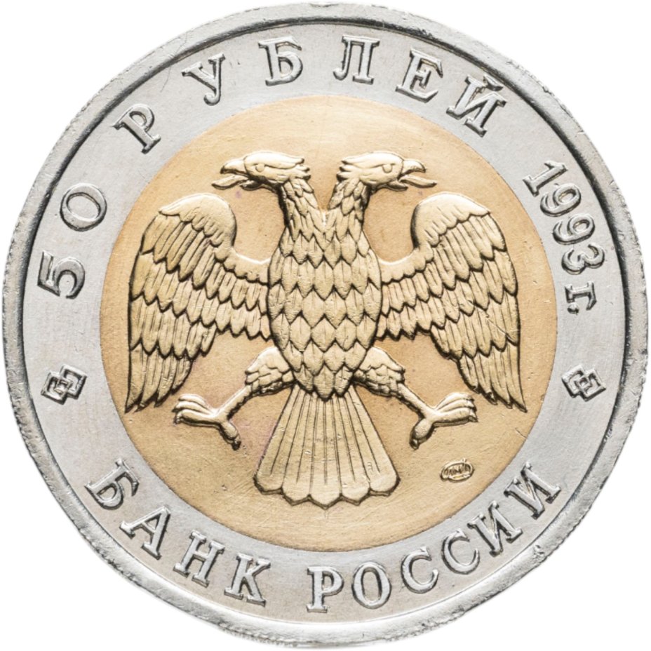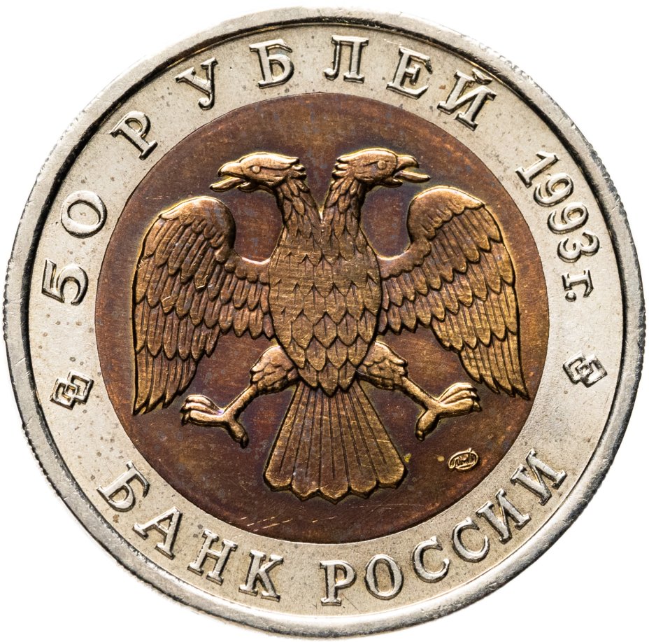 - В 1993 году номинал биметаллических монет увеличивается в пять раз и становится равен 50-и рублям. Кроме того, впервые появляются серебряные монеты номиналом 1 рубль. Они выпускаются в PROOF-качестве. Чеканятся те же животные, которые чеканились на биметалле. Начальный тираж — 50000 штук.