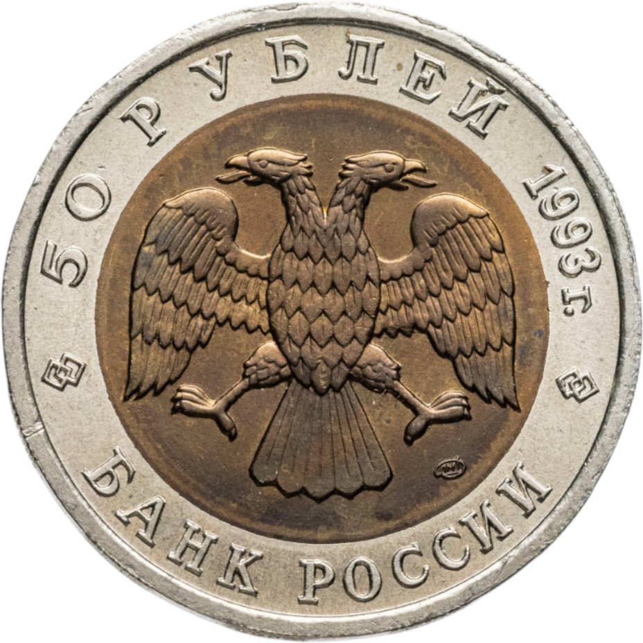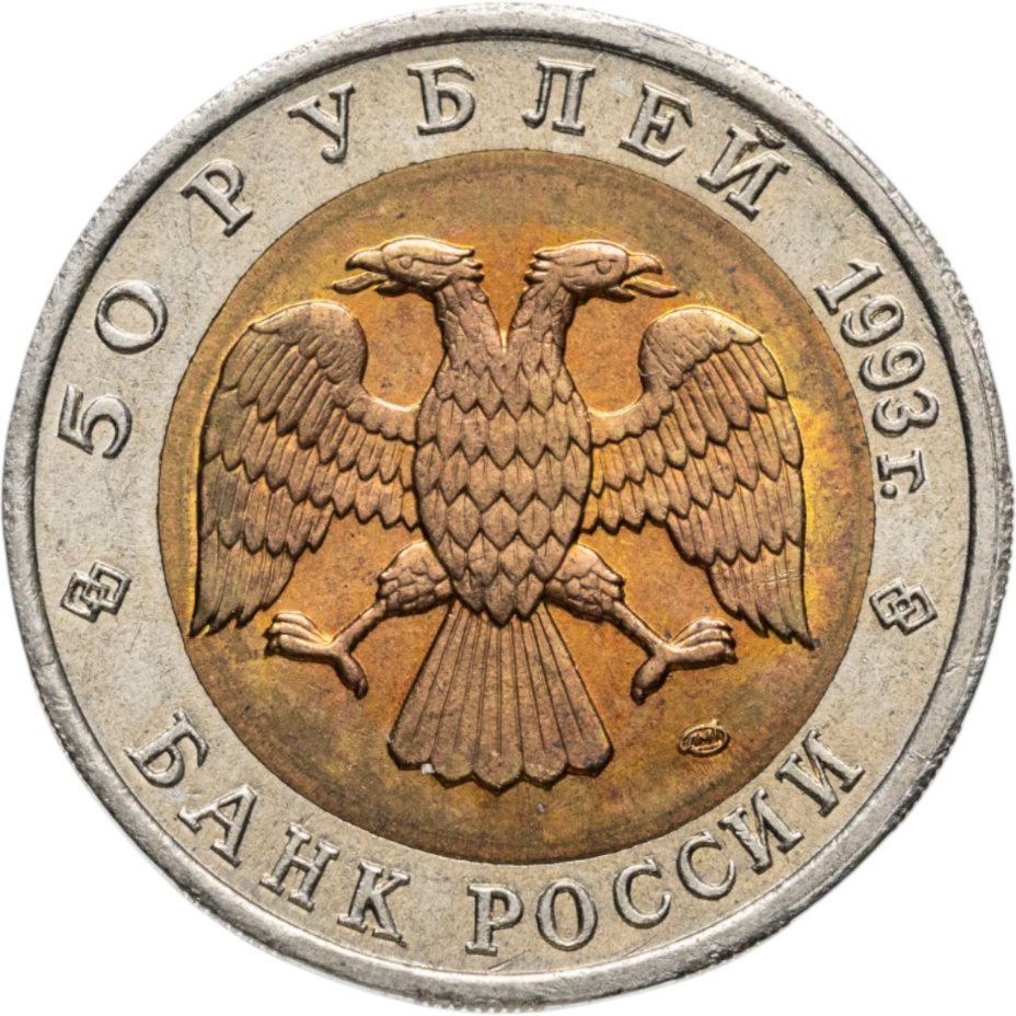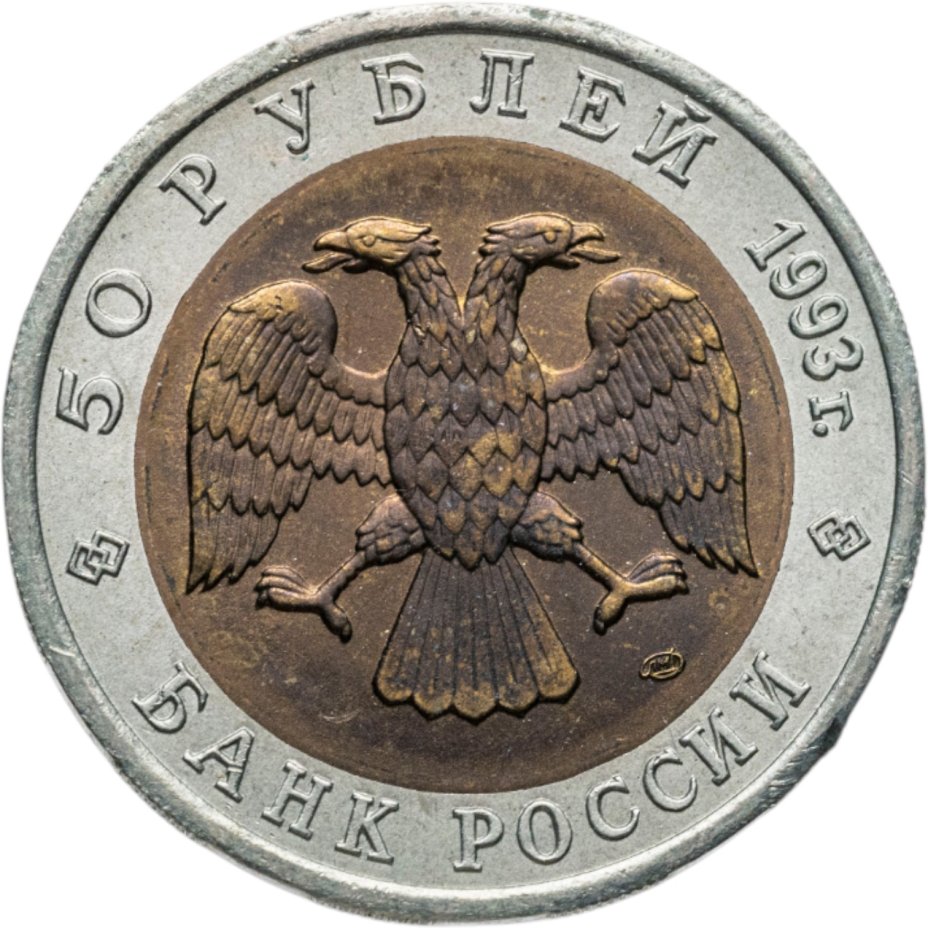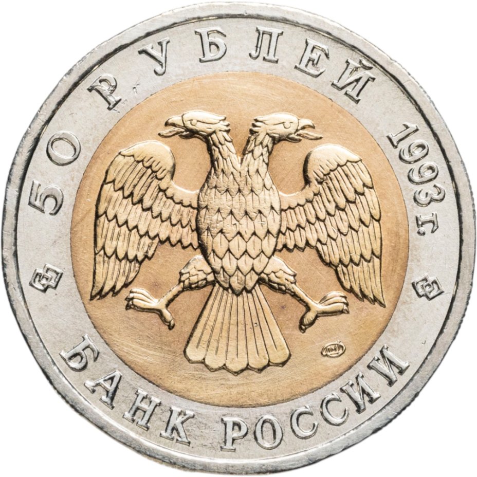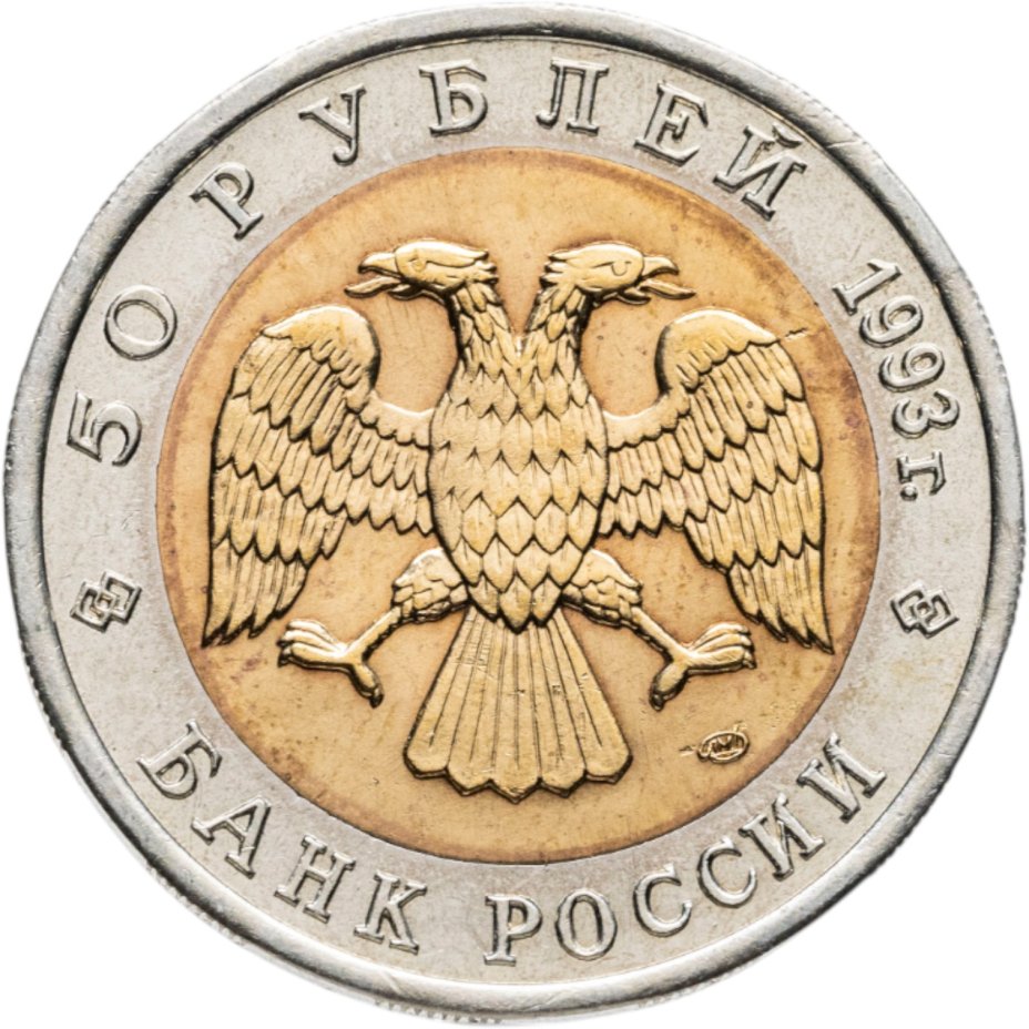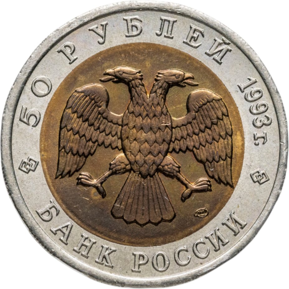 - В 1993 году номинал биметаллических монет увеличивается в пять раз и становится равен 50-и рублям. Кроме того, впервые появляются серебряные монеты номиналом 1 рубль. Они выпускаются в PROOF-качестве. Чеканятся те же животные, которые чеканились на биметалле. Начальный тираж — 50000 штук.