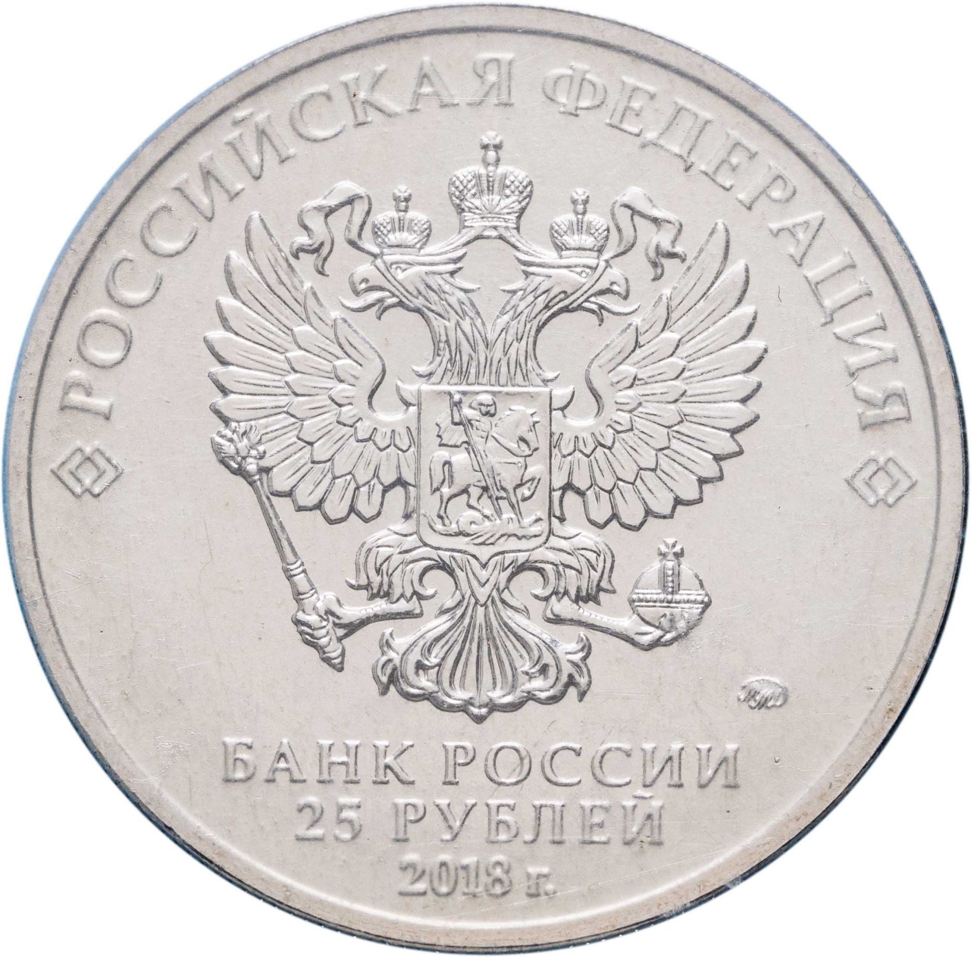 Рельефное изображение Государственного герба Российской Федерации, над ним вдоль канта — надпись полукругом «РОССИЙСКАЯ ФЕДЕРАЦИЯ», обрамленная с обеих сторон сдвоенными ромбами, справа — товарный знак монетного двора, внизу под гербом в центре в три строки — надпись «БАНК РОССИИ», номинал монет — «25 РУБЛЕЙ», дата — «2018 г.».
