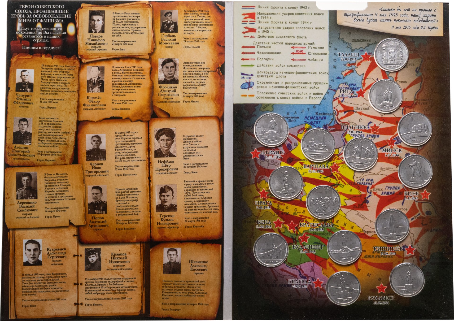 Набор монет «Города-столицы государств» (14 монет) послужит гидом по историческим событиям времён Великой отечественной войны. На реверсах вы увидите памятники павшим русским солдатам.