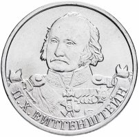 Среди монет «Полководцы и герои Отечественной войны 1812 года» выделяется одна, посвящённая Петру Христофоровичу Витгенштейну. Большинство монет серии вышло с портретами генералов из Военной галереи Зимнего дворца, теми, что писал Джордж Доу по заказу императора Александра I. А вот для монеты Петра Христофоровича был выбран более поздний портрет работы Франца Крюгера. Вероятно, всё дело в том, что изрядную часть наград генерал получил уже после Отечественной войны, участвуя в Заграничных походах и русско-турецкой войне 1828 года. А возможно и в откровенной неприязни императоров, что Александра I, что последовавшего за ним Николая I.