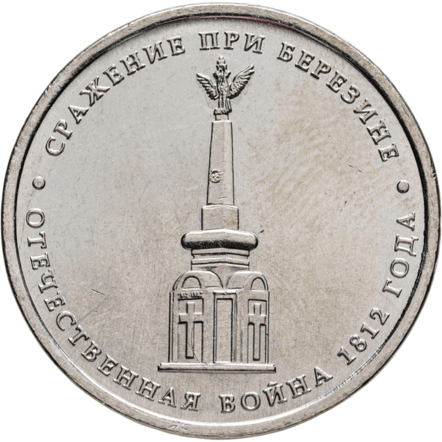 Центральную часть реверса занимает изображение монумента, посвященного памяти солдат, погибших в бою. В торцевых гранях крестообразного основания памятника установлены мраморные кресты, а боковые грани соединяют, выполненные из мрамора, доски с надписями. На таком основании возвышается стела, увенчанная двуглавым орлом с императорской короной. По верхнему краю монеты проходит надпись «Сражение при Березине», отделенная двумя точками от расположенной внизу реверса строчки: «Отечественная война 1812 года».