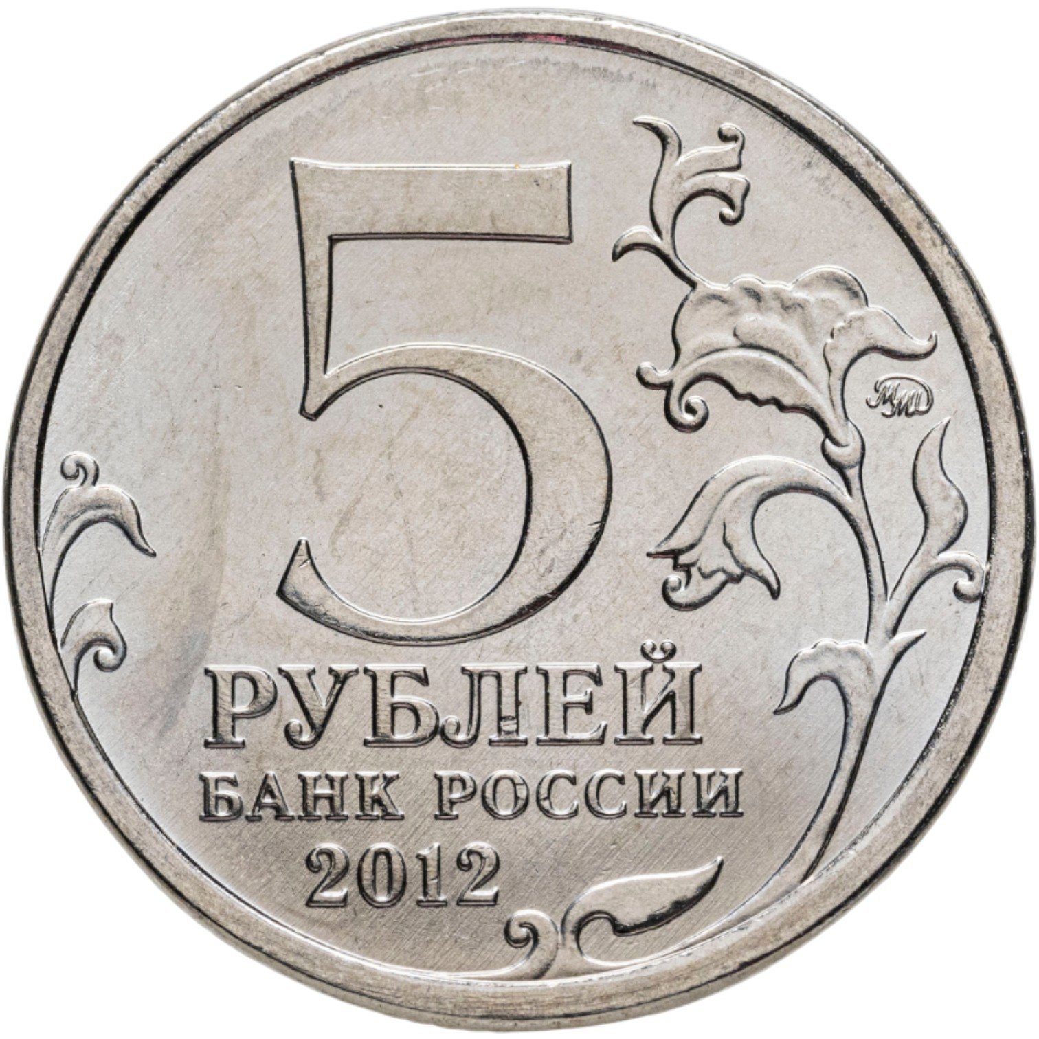 Большую часть аверса занимает номинал монеты, состоящий из двух строчек, сразу под ним указано название банка-эмитента – «Банк России», а в самом низу – год выпуска. Справа аверс обрамлен орнаментом в виде ветки растения, среди листьев которой расположен небольшой знак монетного двора – ММД. Рифленый гурт монеты включает в себя 12 участков по пять рифов. рифленый с гладкими участками.