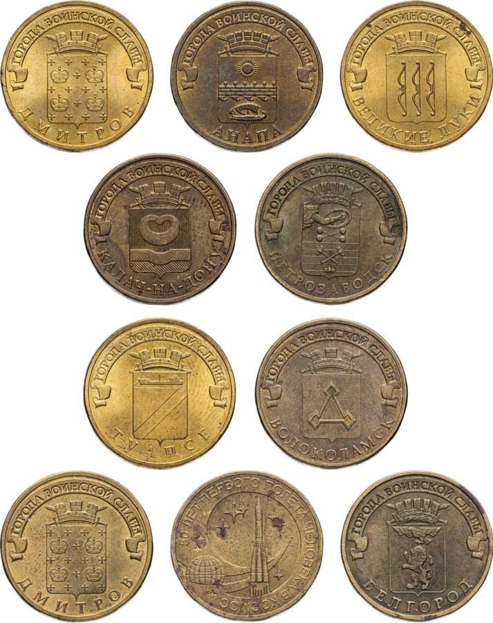 Набор из 10 монет 10 рублей 2011-2016 серии "Города Воинской Славы ГВС"