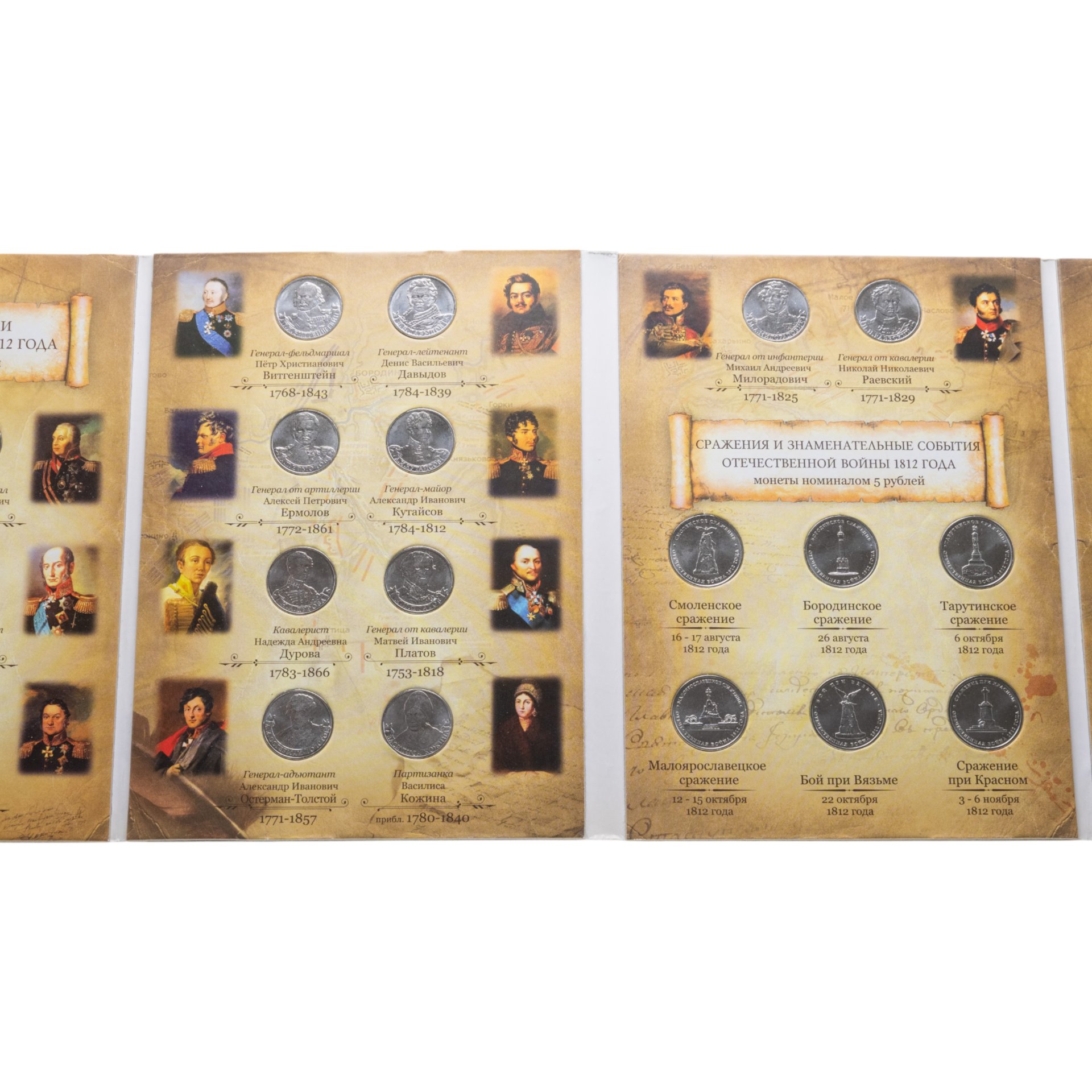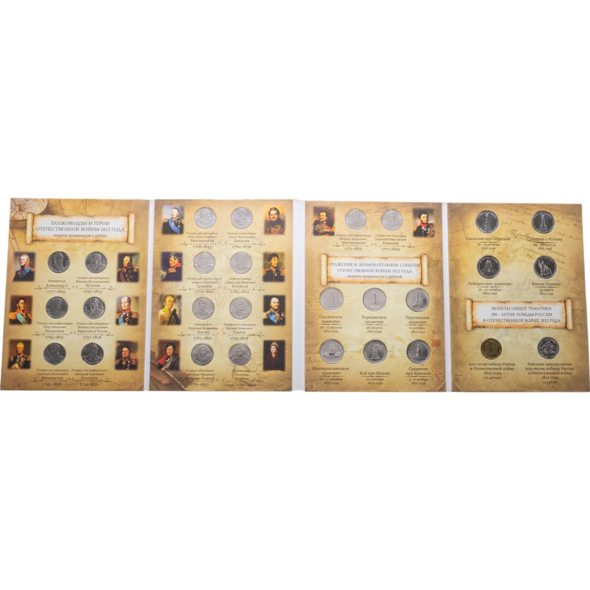 Мы предлагаем вам набор монет о событиях 1812 года, приуроченных к юбилею — 200 лет победы в Отечественной войне. На реверсах отчеканены изображения прославившихся военных деятелей, а также памятники солдатам.