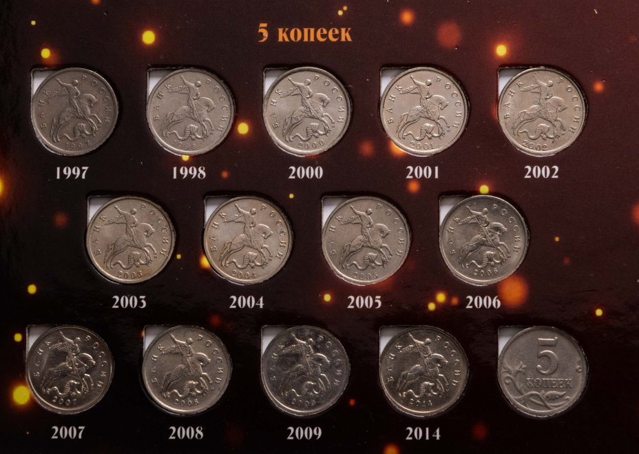 Редкие и дорогие 5 копеек можно найти среди «санкт-петербургских» денег 1997, 2003 и 2005 годов чеканки. Дорогостоящие «московские» пятикопеечники коллекционеры обнаружили в тиражах 2002, 2003, 2005 и 2007 годов.