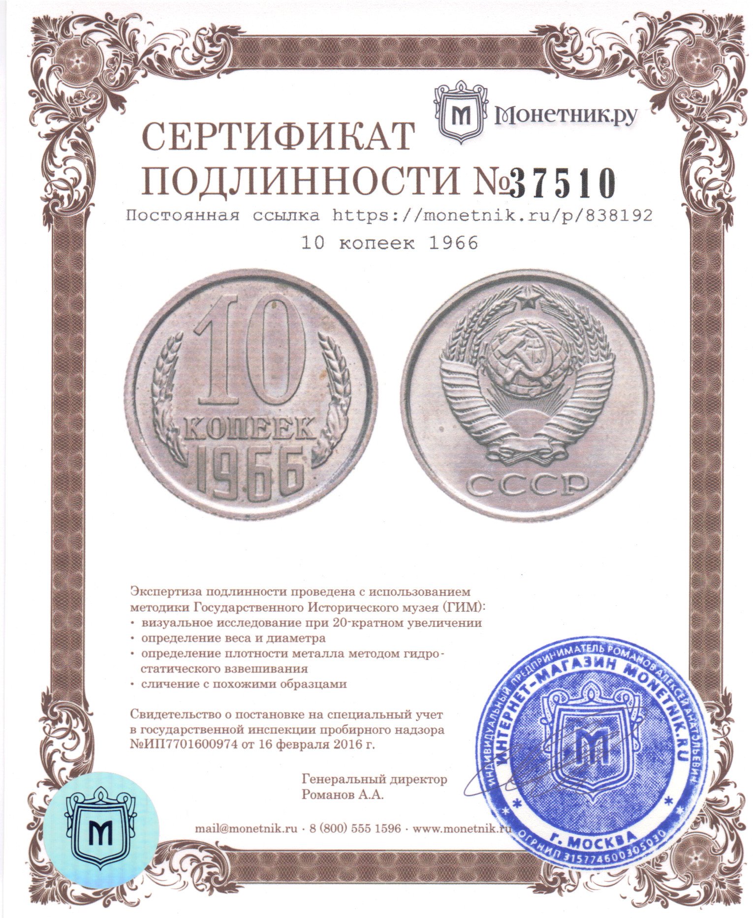• Сертификат подлинности: № 37510