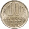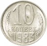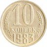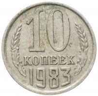Отчеканенная огромным тиражом для массового обращения, монета в 10 копеек образца 1983 года разновидностей не имеет кроме одной: 10 копеек 1983 г. шт. 2.1, изготовленной специально для годового набора Госбанка. Разновидности различаются наличием уступа на наружной гребенке остей справа от звезды на штемпеле 2.1. и отсутствие уступа на штемпеле 2.3. Гривенник 1983 года необходим для полноты коллекции погодовки СССР. Кроме этого, он напомнит о событиях 1983 г.