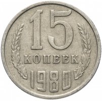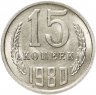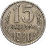 Реверс: В центре вверху номинал «15», под ним слово «КОПЕЕК». Год «1980». Нижние края цифр скошены по изгибу монеты. Слева и справа по два дубовых листа и по одному колосу. С внешней стороны колосья остей не имеют. С внутренней стороны по три ости у каждого колоса.