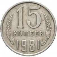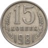 В 1981 году при производстве монет номиналом 15 копеек было использовано два вида штемпеля для аверса - шт. 1 (образца 1961 г.) и шт. 2 (образца 1980 г.). Стоит пояснить, что в 1080 году было принято решение перейти на новый штемпель, с более четким и реалистичным изображением. На старом штемпеле 1 — вторые колосья справа и слева от герба с внутренней стороны без остей, на новом шт. 2 — вторые колосья с остями.