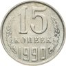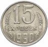 15-копеечные монеты 1990 года выпуска чеканили оба монетных двора: и Московский, и Ленинградский. Тираж, как большинство прочих тиражей советских регулярных монет доподлинно неизвестен. Но, как показывает практика, он был огромным.