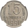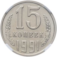 Одна из последних монет уходящей эпохи развитого социализма. В 1991 году исчезнет и Советский Союз, и его денежная система. Монета 15 копеек 1991 года имеет лишь одно отличие от монет предыдущих периодов: наличие логотипа Московского или Ленинградского монетного двора (буквы «М» или «Л» соответственно). Логотип расположен на аверсе, слева внизу от герба. Монета, едва попав в обращение, очень быстро из него вышла, так как деньги СССР были упразднены. Поэтому монеты сохранились в отличном и даже идеальном состоянии, без потертостей и царапин. Стоимость их невысока, но монеты образца 1991 года завершают коллекцию монет советской эпохи.