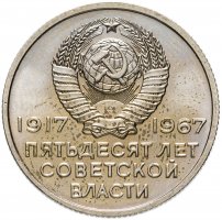 Сверху герб СССР с 15 витками ленты, слева от герба год Великой Октябрьской социалистической революции «1917», справа год выпуска монеты «1967», ниже слова «ПЯТЬДЕСЯТ ЛЕТ СОВЕТСКОЙ ВЛАСТИ».