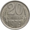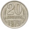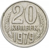 Монета входит в погодовку Советского Союза. Введение в обращение 20 копеек 1979 г. пришлось на год позднего застоя: в СССР провозгласили «развитой социализм». Народ уверен в стабильности и незыблемости Советского Союза.
