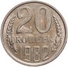 Реверс: Слева и справа гирлянды из колосьев и дубовых листьев. Номинал сверху в центре «20», ниже слово «копеек», под ним год «1982». Нижние штрихи цифр идут под углом, по закруглению монеты. Диаметр 21 мм., толщина 1,4 мм, вес 3,4 гр., материал: сплав меди и никеля с добавлением цинка (нейзильбер).