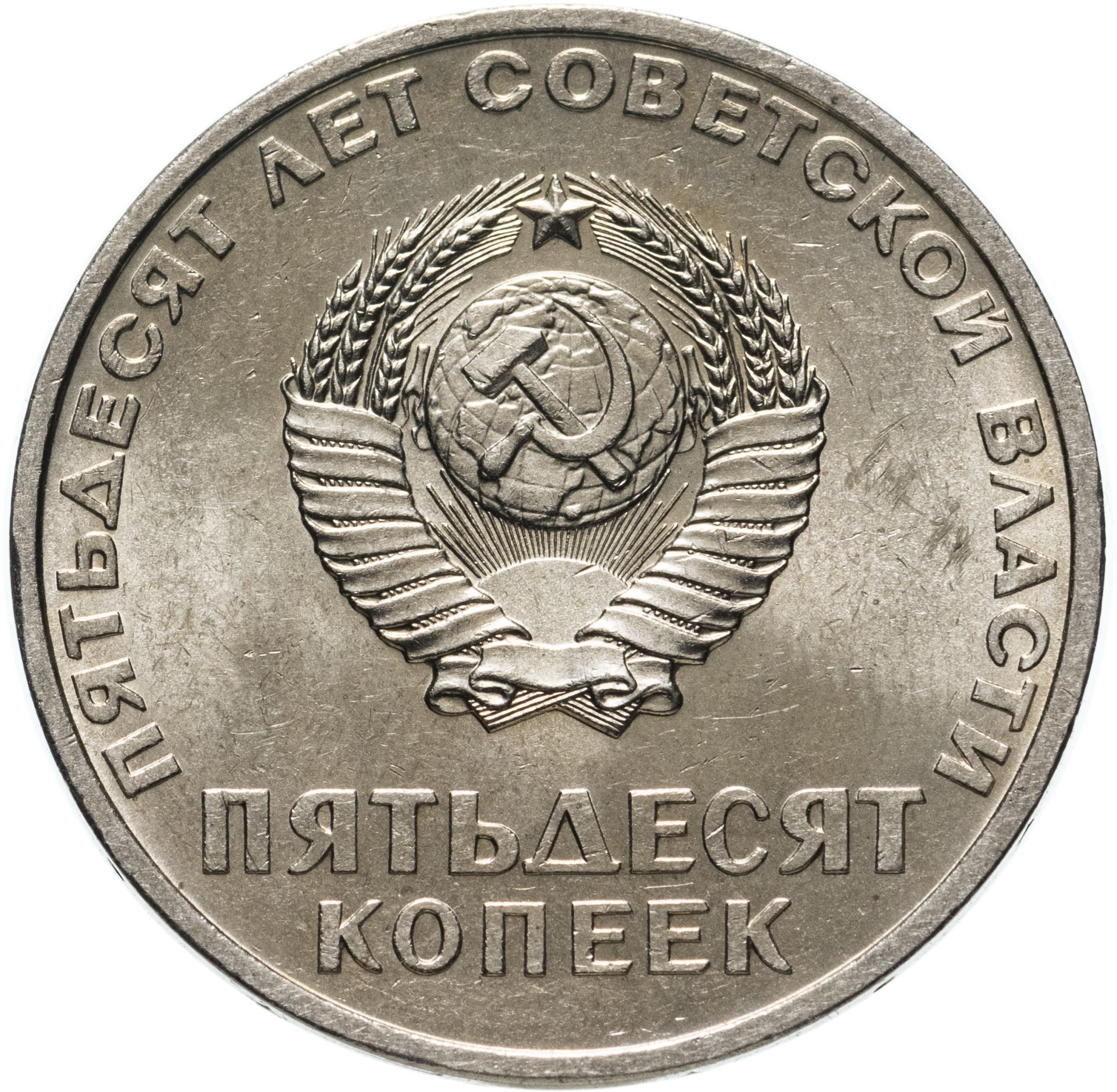 Сверху вдоль края монеты слова «ПЯТЬДЕСЯТ ЛЕТ СОВЕТСКОЙ ВЛАСТИ», в центре герб СССР с 15 витками ленты, под ним обозначение достоинства монеты «ПЯТЬДЕСЯТ» и ниже слово «КОПЕЕК».