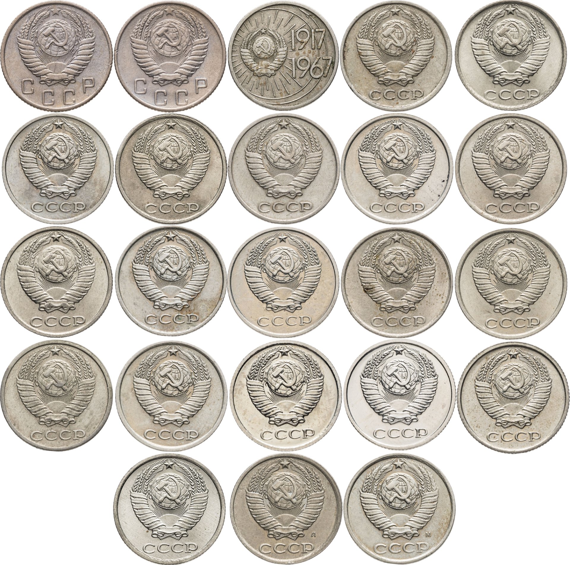 Набор 10 копеек СССР ( 21 штука ) 1967 - 1991 (Л , М ) , без повторов + бонус 10 копеек 1955 , 10 копеек 1956