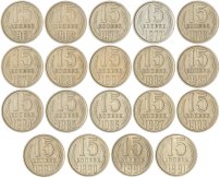 Набор 15 копеек СССР ( 19 штук ) 1961-1991