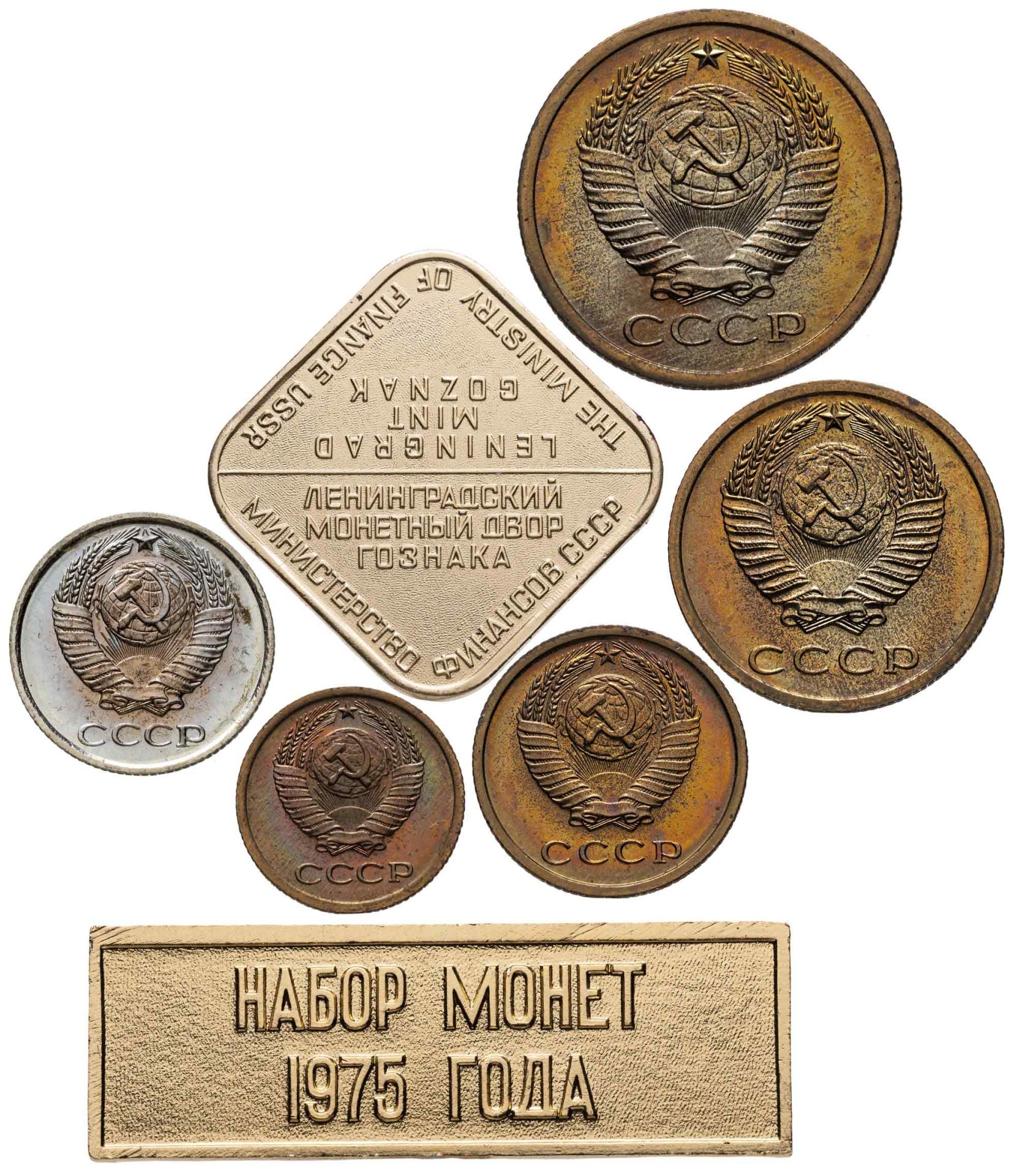 Купить Набор монет СССР 1975 года 1, 2, 3, 5 и 10 копеек (5 монет, жетон ЛМД и шильдик)