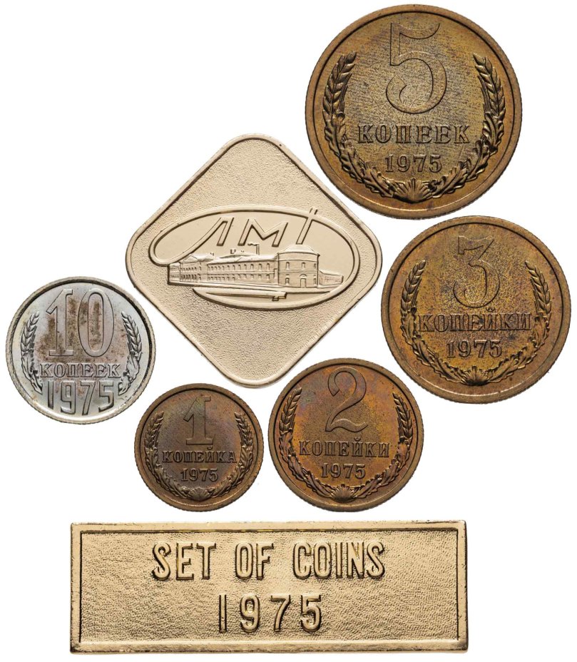 Набор монет СССР 1975 года 1, 2, 3, 5 и 10 копеек (5 монет, жетон ЛМД и шильдик)