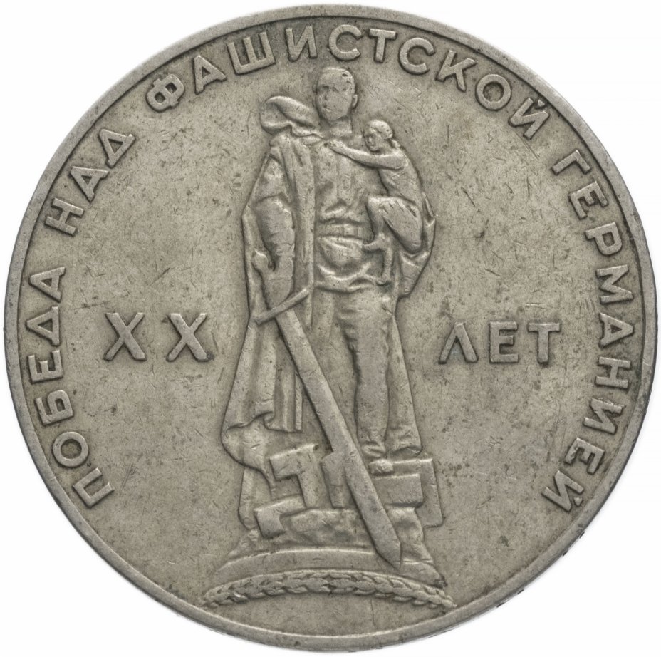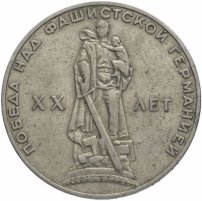 В этом же году, 28 апреля, в оборот были выпущены первые в истории страны юбилейные монеты. В честь величайшего события - 20-летия Победы над фашистской Германией, вышла памятная монета достоинством в 1 рубль. Так зародилось новое веяние в монетном искусстве, давшее толчок к развитию подобных серий в будущем, которое на сегодняшний момент успешно продолжается.