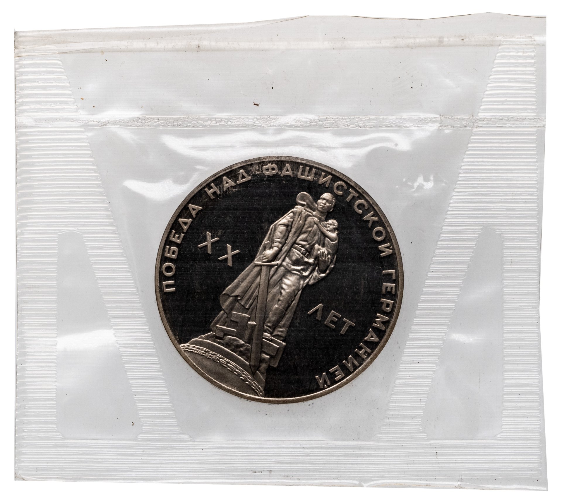 В этом же году, 28 апреля, в оборот были выпущены первые в истории страны юбилейные монеты. В честь величайшего события - 20-летия Победы над фашистской Германией, вышла памятная монета достоинством в 1 рубль. Так зародилось новое веяние в монетном искусстве, давшее толчок к развитию подобных серий в будущем, которое на сегодняшний момент успешно продолжается.