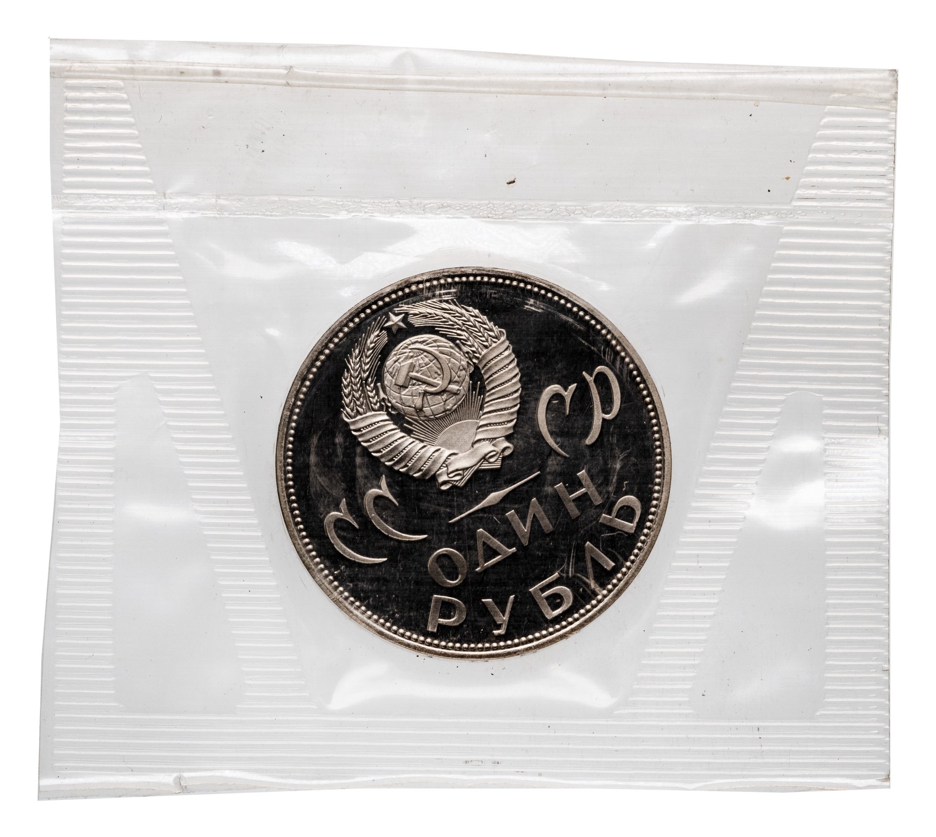 На аверсе вверху находится герб СССР, слева первая часть аббревиатуры «СС», справа окончание «СР», разделяет буквы полоса с ромбом посередине. Внизу прописан номинал монеты «ОДИН РУБЛЬ». По окружности точечный ободок.