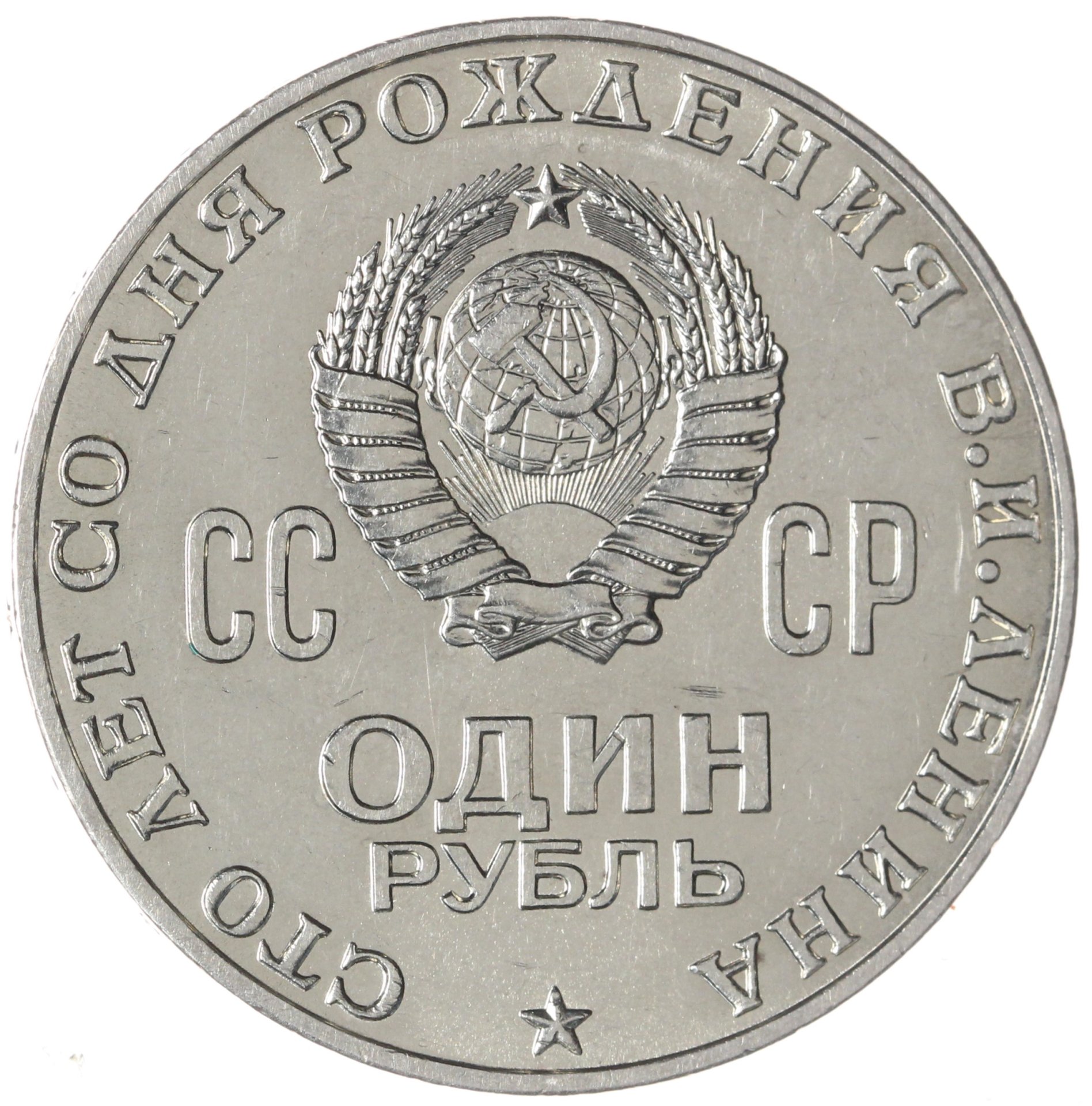 Дизайн реверса монеты создал Виктор Ермаков – художник Гознака, творчество которого отличала ювелирная точность, невероятная тщательность, педантичность, детализация и техническая грамотность. На реверсе 1 рубля герб СССР, занимающий центр верхней половины круглого поля, дополнен двумя строчками номинала, ниже которого изображена звёздочка. От звезды расходится круговая легенда «Сто лет со дня рождения В. И. Ленина». Слева и справа от герба – разделённая на 2 части надпись «СССР». Гурт монеты оформлен чередующимися звёздочками и точками.