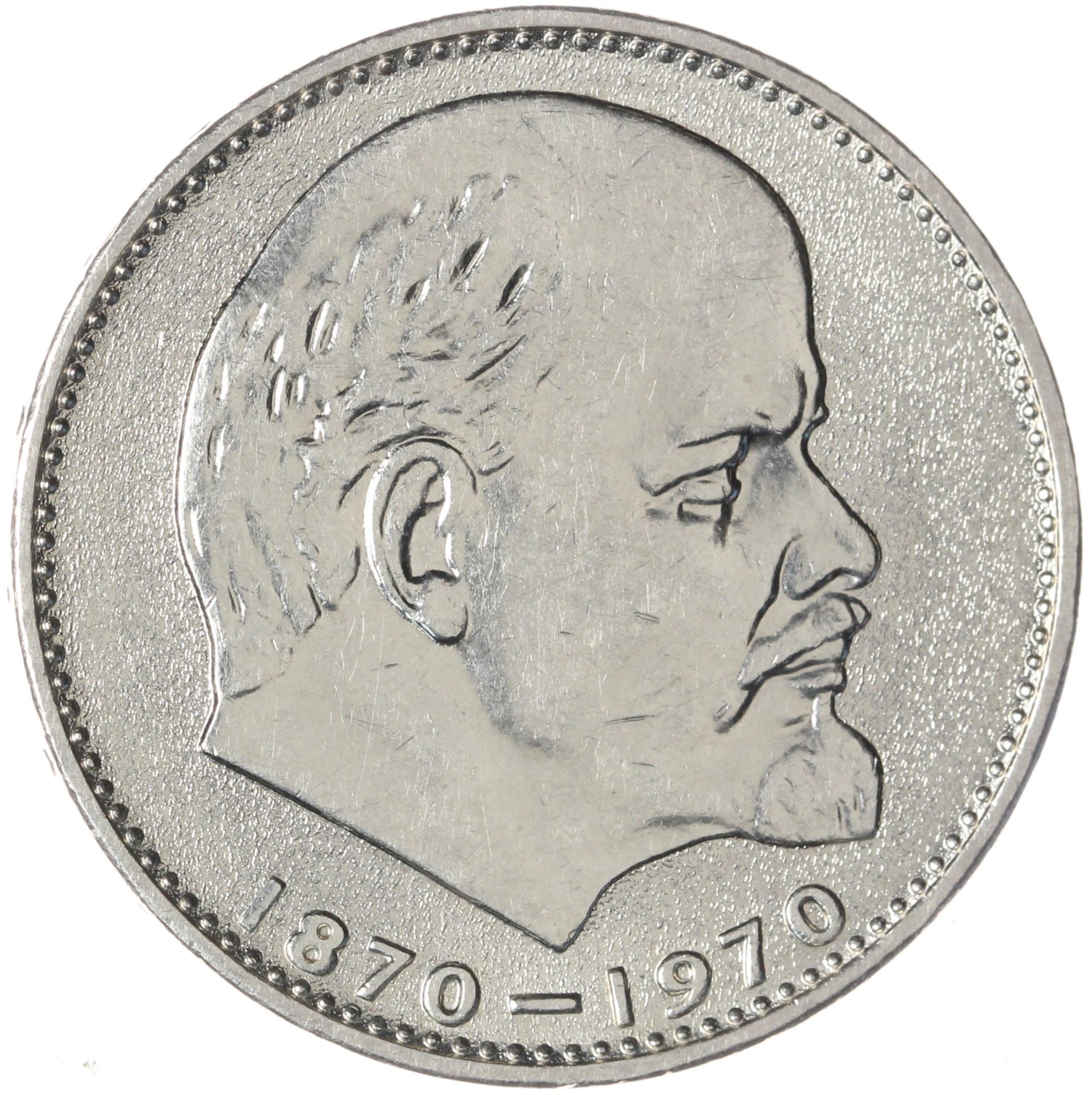 Юбилейные и памятные монеты Страны Советов создавали лучшие мастера – художники, гравёры, скульпторы. Над аверсом юбилейного рубля работал Николай Соколов – скульптор, главный художник Ленинградского монетного двора в 1950–1971 году, автор многочисленных медалей, в частности, с портретами государственных деятелей СССР. Лицевую сторону монеты занимает глянцевое изображение повёрнутой вправо головы Ленина. Портрет размещён на шероховатом поле, под ним – полукруглая легенда «1870–1970».