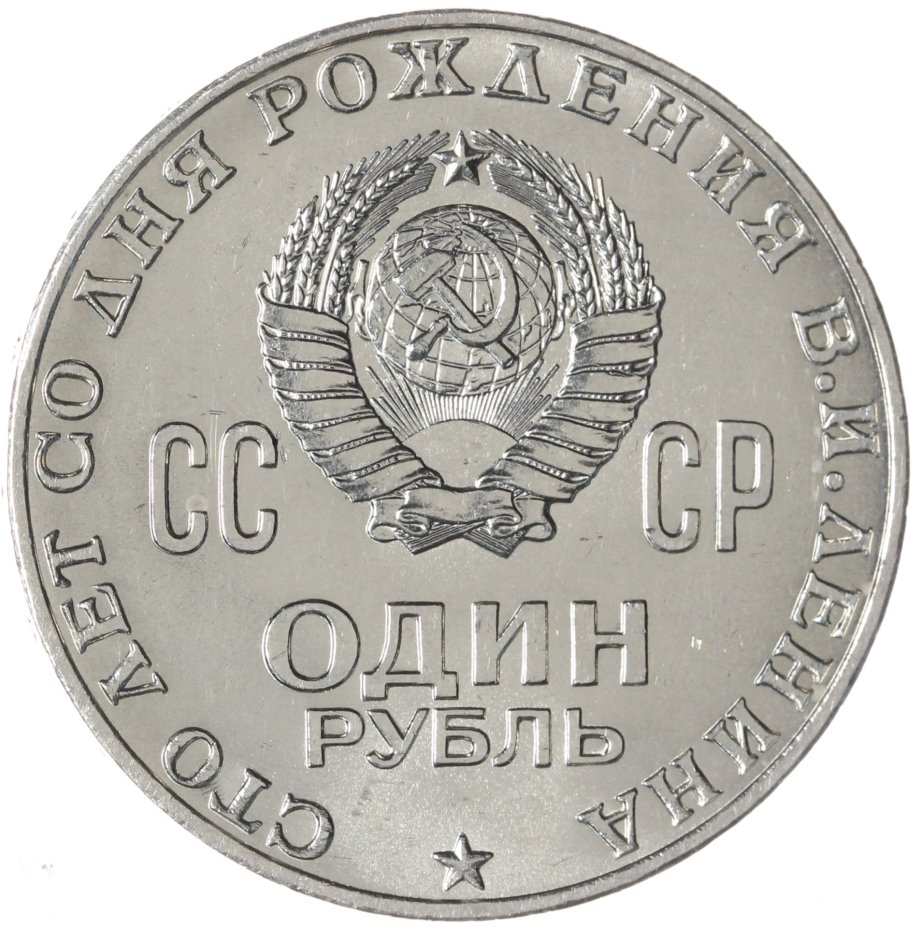 Дизайн реверса монеты создал Виктор Ермаков – художник Гознака, творчество которого отличала ювелирная точность, невероятная тщательность, педантичность, детализация и техническая грамотность. На реверсе 1 рубля герб СССР, занимающий центр верхней половины круглого поля, дополнен двумя строчками номинала, ниже которого изображена звёздочка. От звезды расходится круговая легенда «Сто лет со дня рождения В. И. Ленина». Слева и справа от герба – разделённая на 2 части надпись «СССР». Гурт монеты оформлен чередующимися звёздочками и точками.
