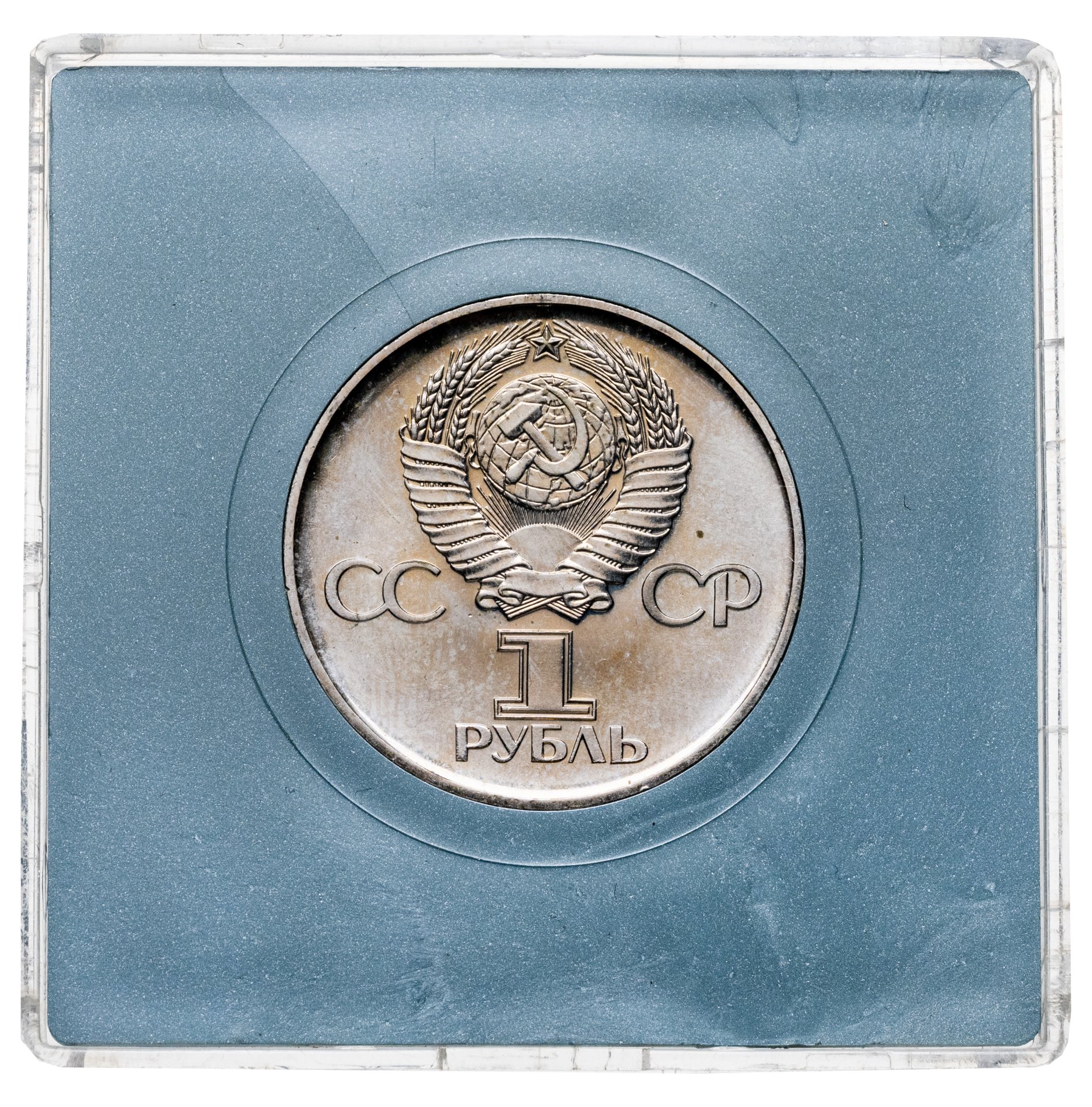 На аверсе в верхней части изображён Государственный герб СССР. Его классическое изображение — серп и молот, за ними земной шар с восходящим солнцем, наверху пятиконечная звезда, по бокам снопы пшеницы, перевязанные пятнадцатью лентами по количеству республик, входящих в состав СССР. Слева и справа буквы "СС" и "СР". Ниже указан номинал — цифра один и слово "рубль".