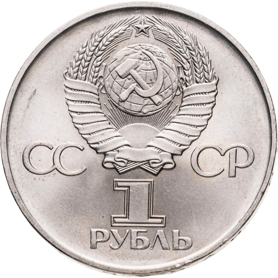 Сверху герб СССР с 15 витками ленты, слева от него буквы «СС», справа «СР», ниже обозначение достоинства монеты цифра «1» и ниже слово «РУБЛЬ».
