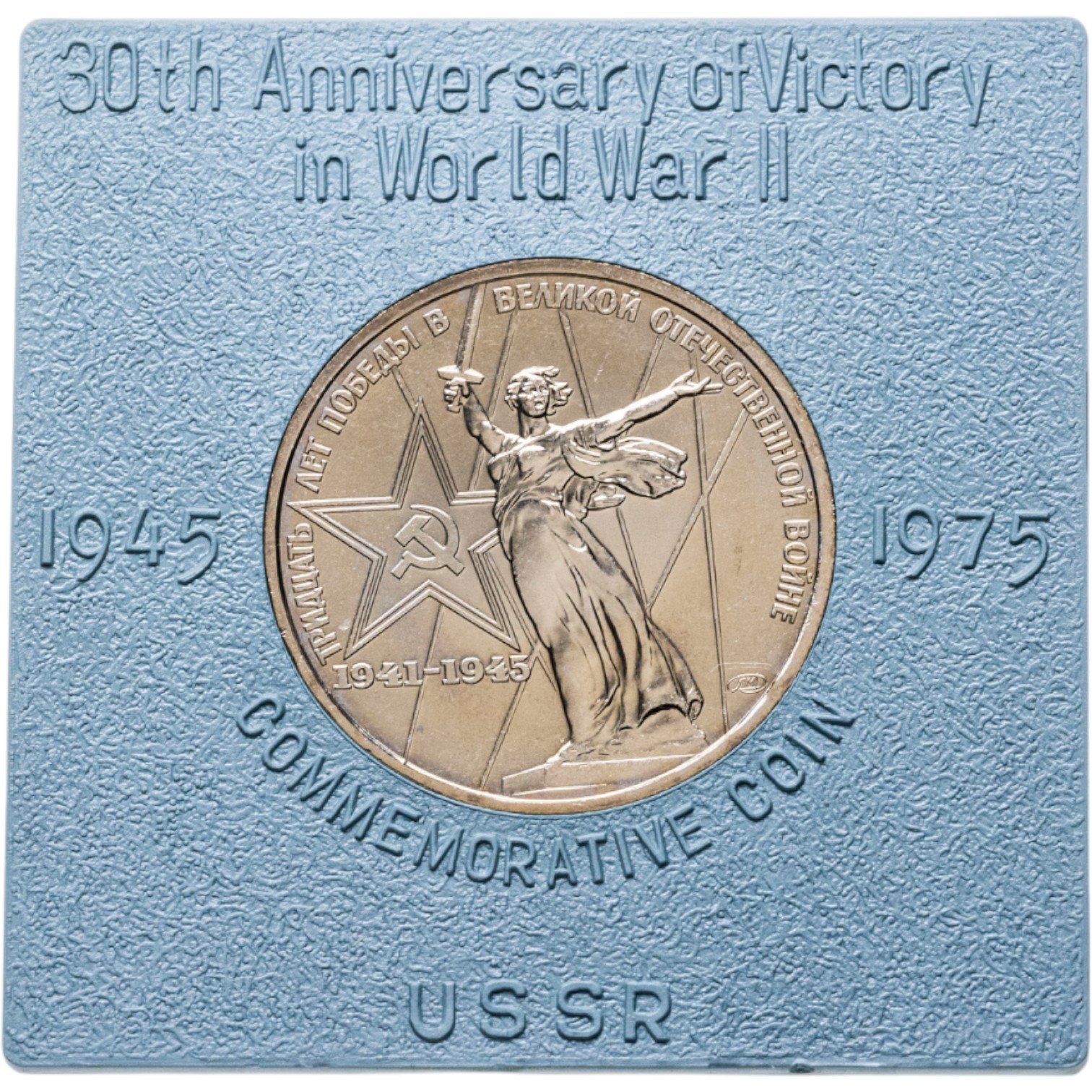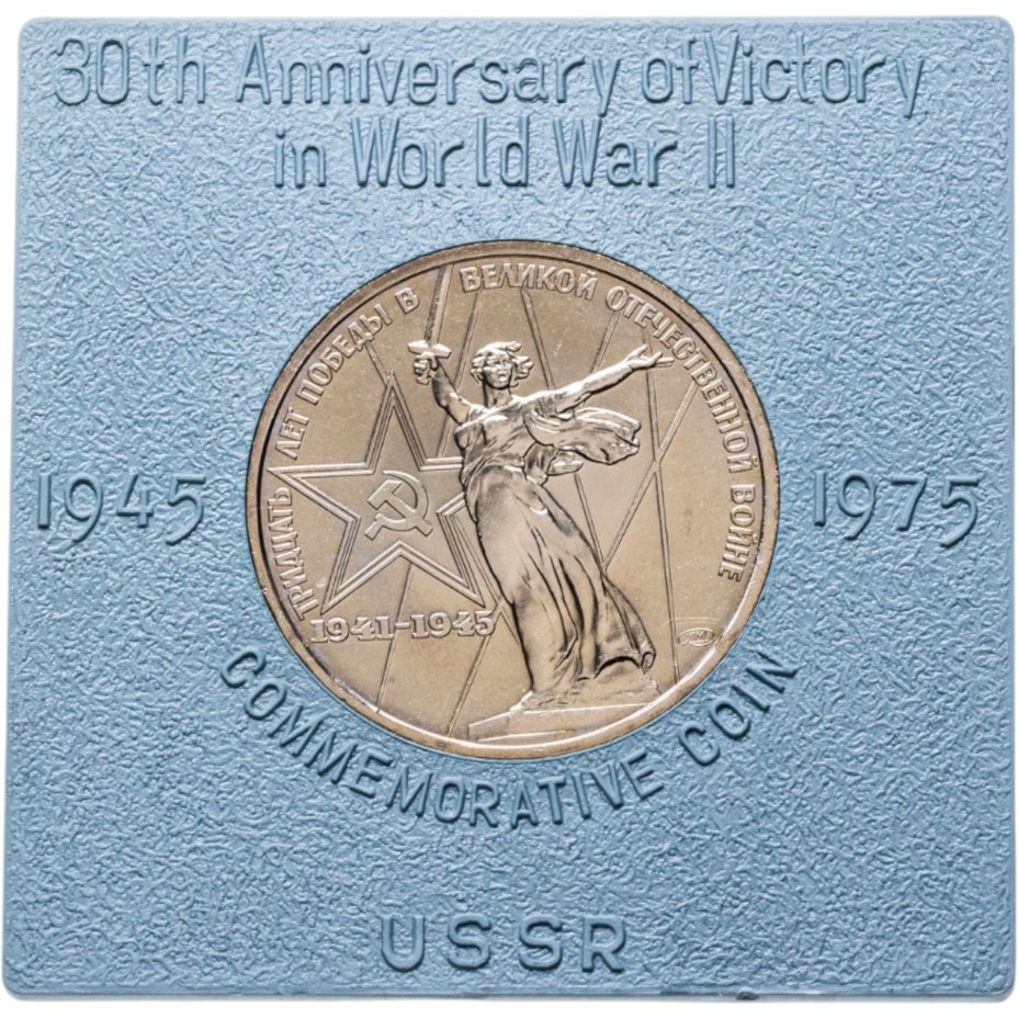 В центре изображение скульптуры Е. В. Вучетича «Родина-Мать» из памятника - ансамбля героям Сталинградской битвы в Волгограде, Слева от скульптуры пятиконечная звезда с серпом и молотом в центре, под звездой цифры «1941-1945». Звезда и скульптура расположены на фоне шести лучей прожекторов, изображающих цифру «XXX». По кругу надпись «ТРИДЦАТЬ ЛЕТ ПОБЕДЫ В ВЕЛИКОЙ ОТЕЧЕСТВЕННОЙ ВОЙНЕ». Ниже окончания круговой надписи монограмма Ленинградского монетного двора.