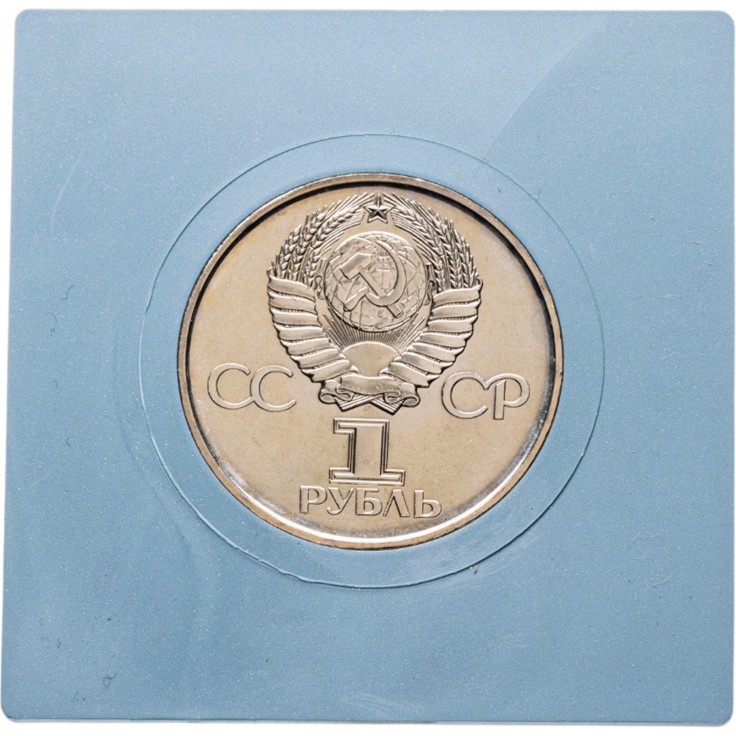 Сверху герб СССР с 15 витками ленты, слева от него буквы «СС», справа «СР», ниже обозначение достоинства монеты цифра «1» и ниже слово «РУБЛЬ».