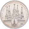 На основании Спасской башни отчеканена эмблема Московской олимпиады: сплетённые 5 колец, а над ними – уходящие ввысь спортивные дорожки, увенчанные звездой. Конкурс на создание эмблемы шёл с 1 июня по 31 декабря 1975 года. Всего было прислано более 26 тысяч различных работ, из которых жюри и выбирало победителя. В итоге, выбрали идею эмблемы, которую предложил 25-летний латвийский художник-оформитель Владимир Арсентьев. Разумеется, затем эмблема была доработана профессиональными художниками и дизайнерами, прикладными графиками В. Дьяковым и В. Акоповым.