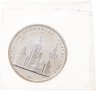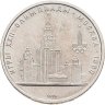 Московский государственный университет им. М.В. Ломоносова является не только одним из престижнейших вузов нашей страны, но и бесспорным символом Москвы наряду с Кремлём. МГУ также старейший российский ВУЗ, был основан в 1755 году. Великое множество виднейших деятелей науки и культуры вышло из этих стен. В наши дни в университете обучается около 45000 студентов, ведется научно — исследовательская работа. На интересующей нас монете изображён главный корпус МГУ, построенный в 1949 - 1953 годах. Высота его башни - 240 метров, дополнительно шпиль длиной 58 метров. Здание насчитывает 32 этажа, это самый высокий из небоскребов, построенный в эпоху правления Сталина в Москве. Обладает абсолютной симметрией.
