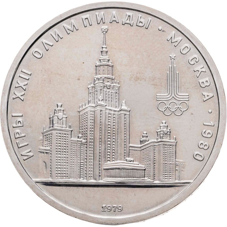 На реверсе - в центре рельефное изображение главного корпуса МГУ им. М.В. Ломоносова. Под ним год чеканки монеты - "1979". С левой стороны изображение эмблемы Олимпиады-80, являющей собой 5 олимпийских колец, и устремленные вверх линии с пятиконечной звездой на конце. Вдоль канта размещены надписи " Игры ХХ11 Олимпиады", "Москва" и "1980". Они разделяются точками.