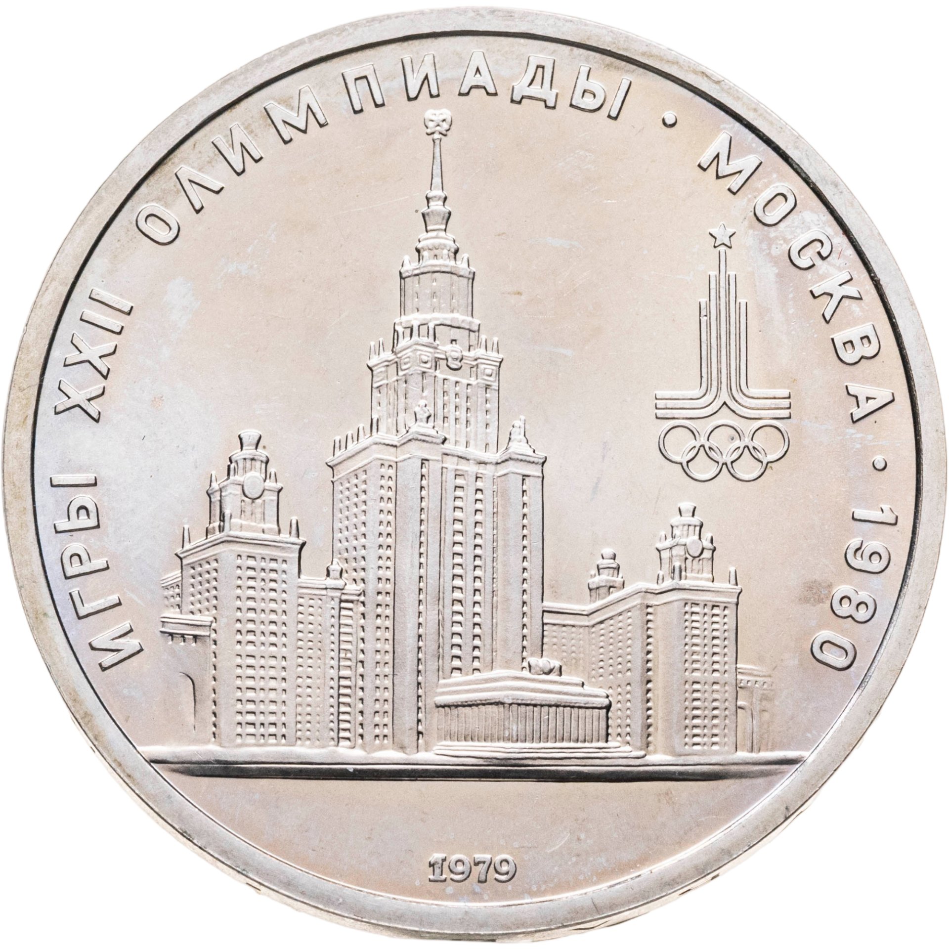 На реверсе - в центре рельефное изображение главного корпуса МГУ им. М.В. Ломоносова. Под ним год чеканки монеты - "1979". С левой стороны изображение эмблемы Олимпиады-80, являющей собой 5 олимпийских колец, и устремленные вверх линии с пятиконечной звездой на конце. Вдоль канта размещены надписи " Игры ХХ11 Олимпиады", "Москва" и "1980". Они разделяются точками.