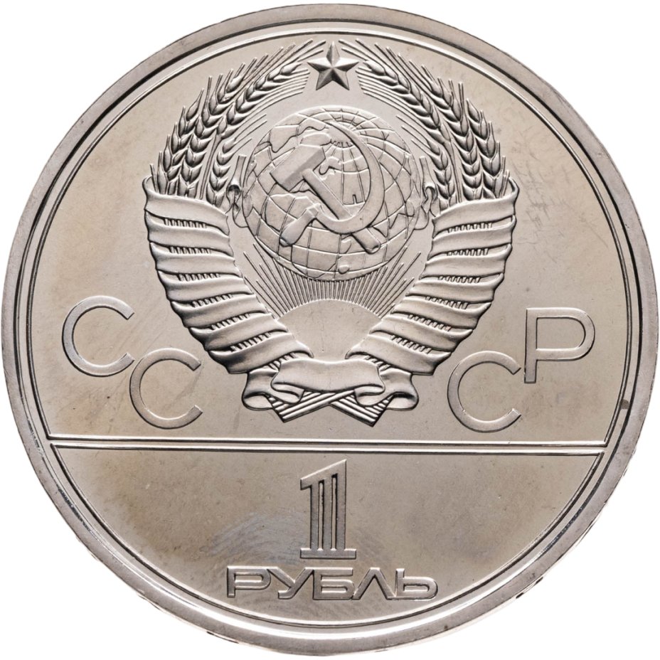 Сверху герб СССР с 15 витками ленты, слева от него буквы «СС», справа «СР», ниже двойная черта, под ней обозначение достоинства монеты цифра «1» и ниже слово «РУБЛЬ».
