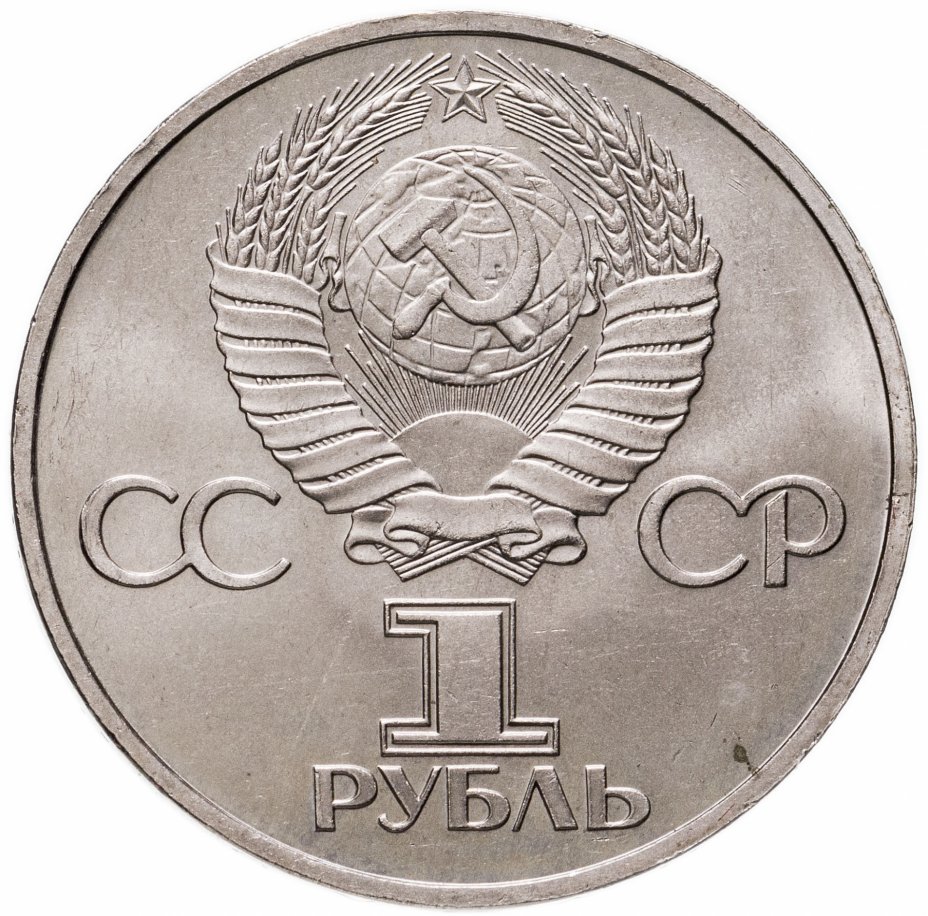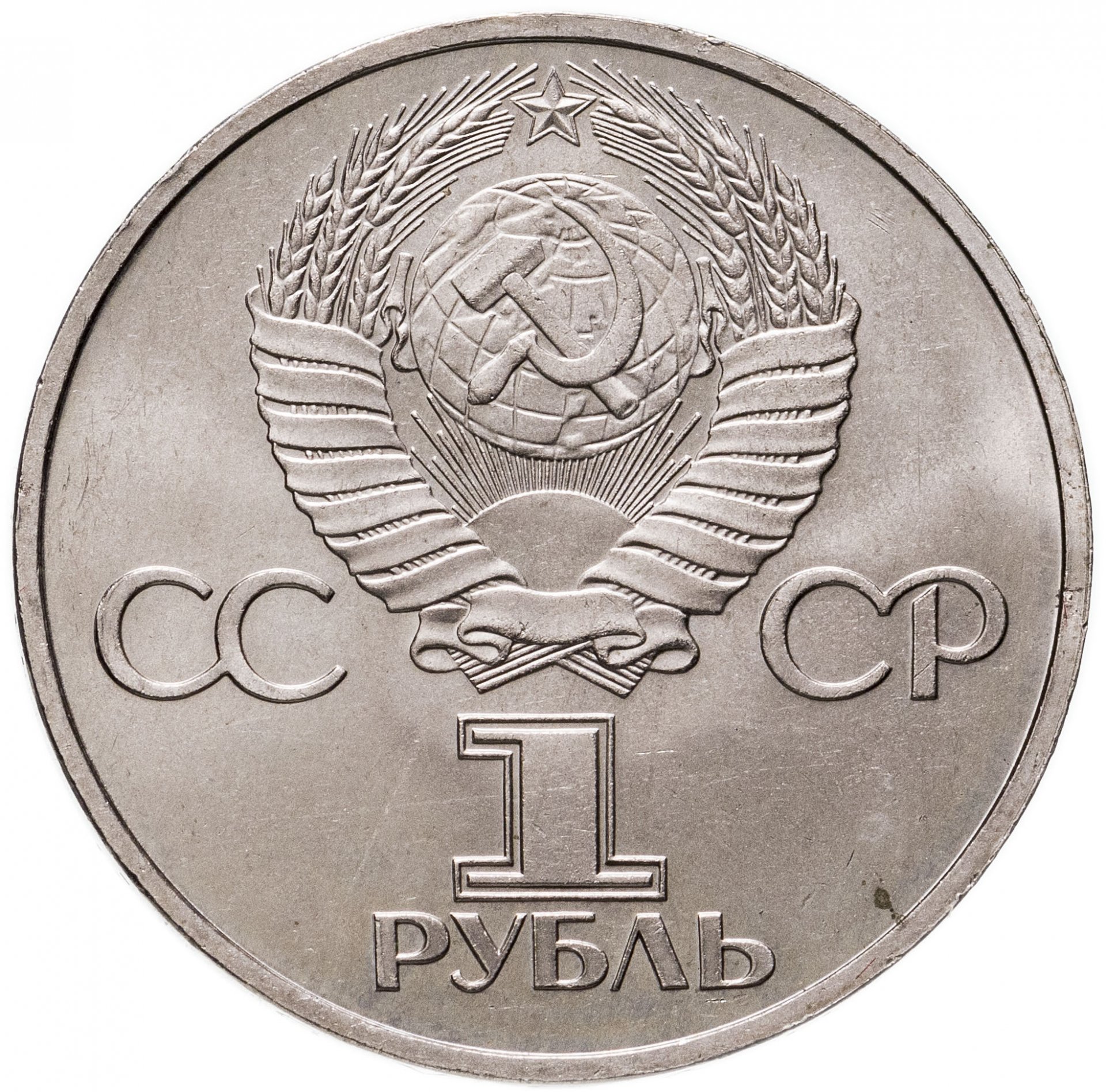 Сверху герб СССР с 15 витками ленты, слева от него буквы «СС», справа «СР», ниже обозначение достоинства монеты цифра «1» и ниже слово «РУБЛЬ».