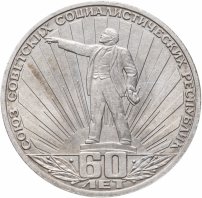 Юбилейный рубль, посвящённый 60-летию образования Союза Советских Социалистических Республик, украшает портрет Великого Вождя, направляющего характерным взмахом руки в светлое будущее страны и народы. Это самое «светлое будущее» символизируют лучи восходящего солнца. Впрочем, такой дизайн можно интерпретировать и как «восход СССР», у истоков которого и стоял Владимир Ильич.