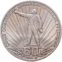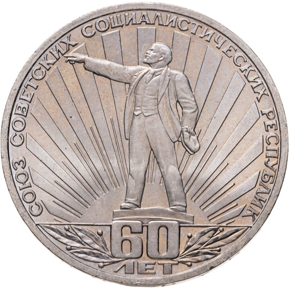 Юбилейный рубль, посвящённый 60-летию образования Союза Советских Социалистических Республик, украшает портрет Великого Вождя, направляющего характерным взмахом руки в светлое будущее страны и народы. Это самое «светлое будущее» символизируют лучи восходящего солнца. Впрочем, такой дизайн можно интерпретировать и как «восход СССР», у истоков которого и стоял Владимир Ильич.