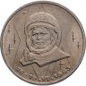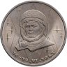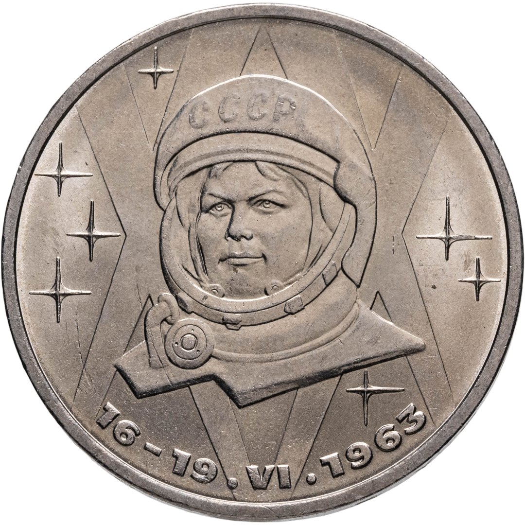 На реверсе монеты по центру рельефная изображение Валентины Терешковой в характерном космическом шлеме. На заднем фоне римская цифра "XX". Ниже указаны даты полёта.