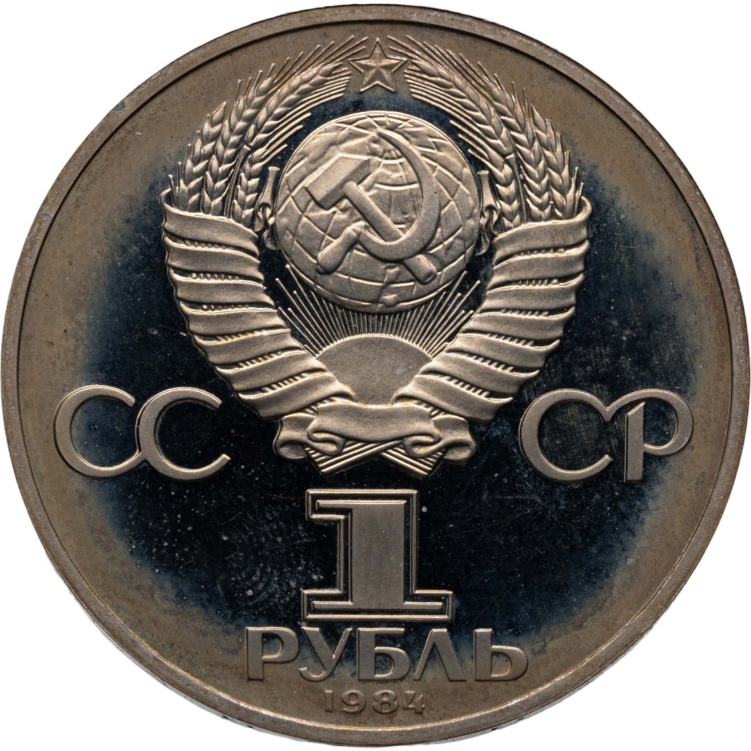 Сверху герб СССР с 15 витками ленты, слева от него буквы «СС», справа «СР», ниже обозначение достоинства монеты цифра «1» и ниже слово «РУБЛЬ», внизу у канта год выпуска монеты «1984».
